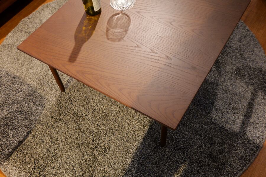 天板を浮いているように見せる特徴的な幕板デザインのリビングテーブル。