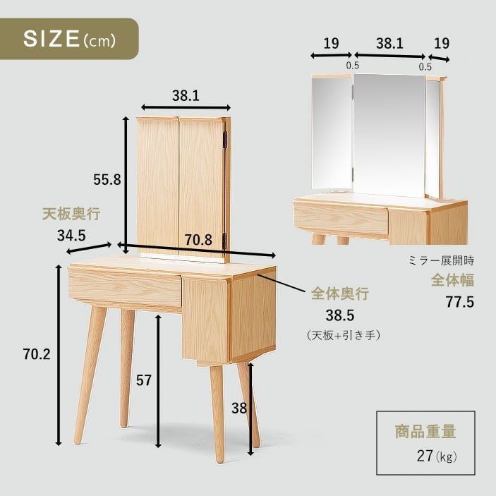 ドレッサー・スツールセット CLASSE ティペットⅡドレッサー 鏡台 木製 オーク ウォールナット ブラウン 北欧 ナチュラル かわいい おしゃれ 天然木 三面鏡