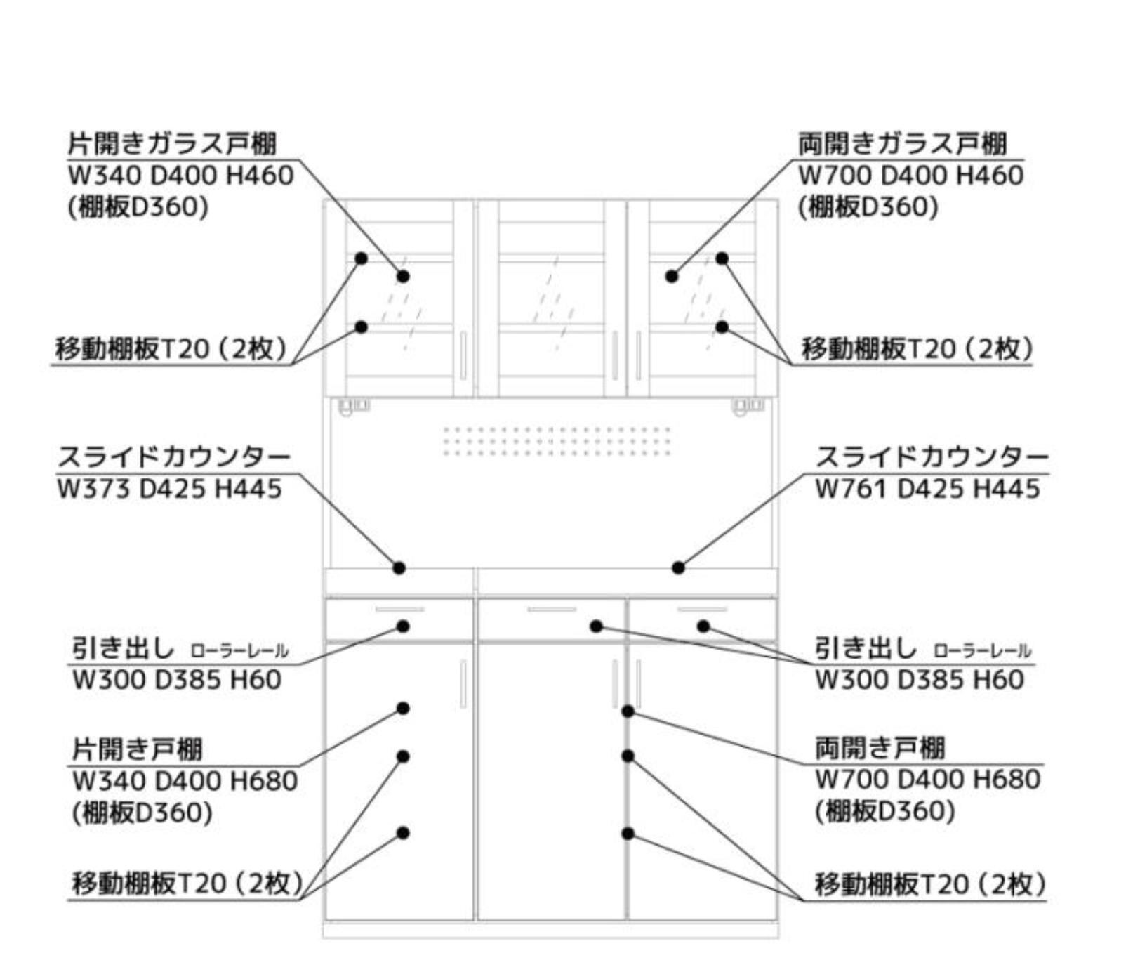 上部はガラス扉付きの収納棚、中央は家電や作業スペースとして使えるオープン仕様、下部は大容量の収納を備えた実用性の高い構成。