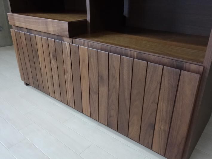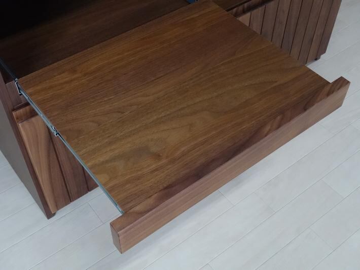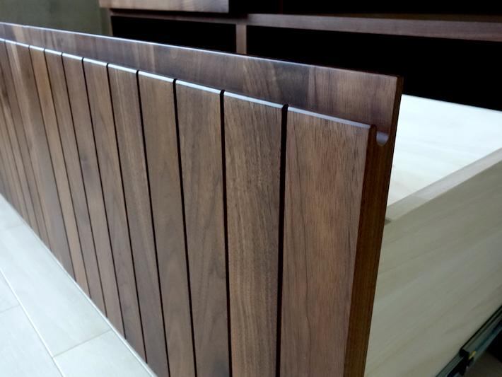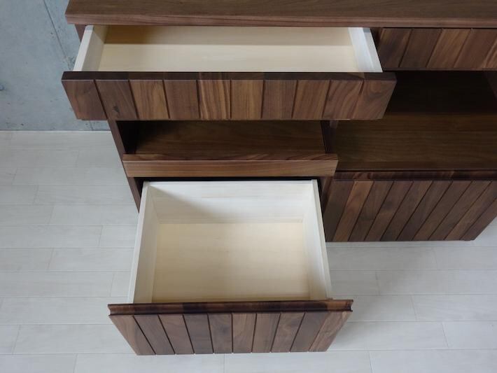 表情の異なる無垢材を貼り合わせた前板あ高級感を醸し出す。