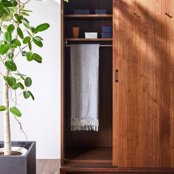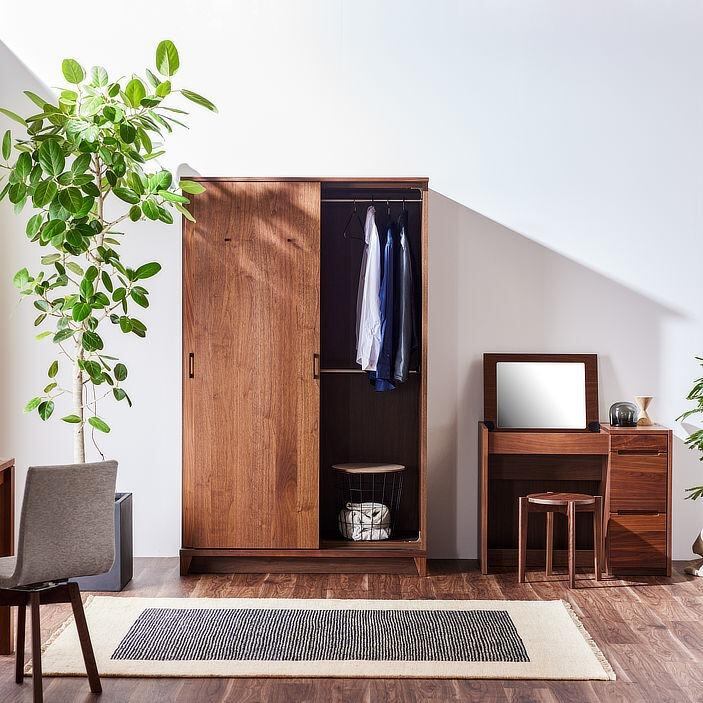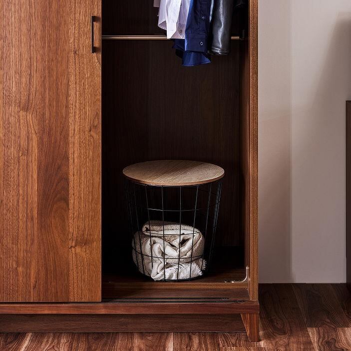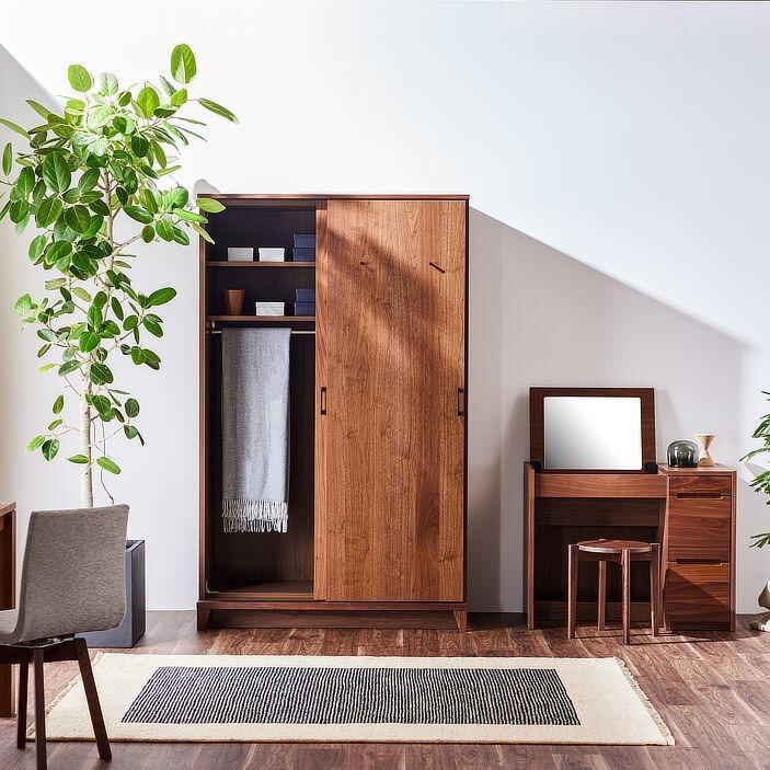 姿見(ミラー)付きワードローブは、収納力と機能美を兼ね備えた上質な佇まい。