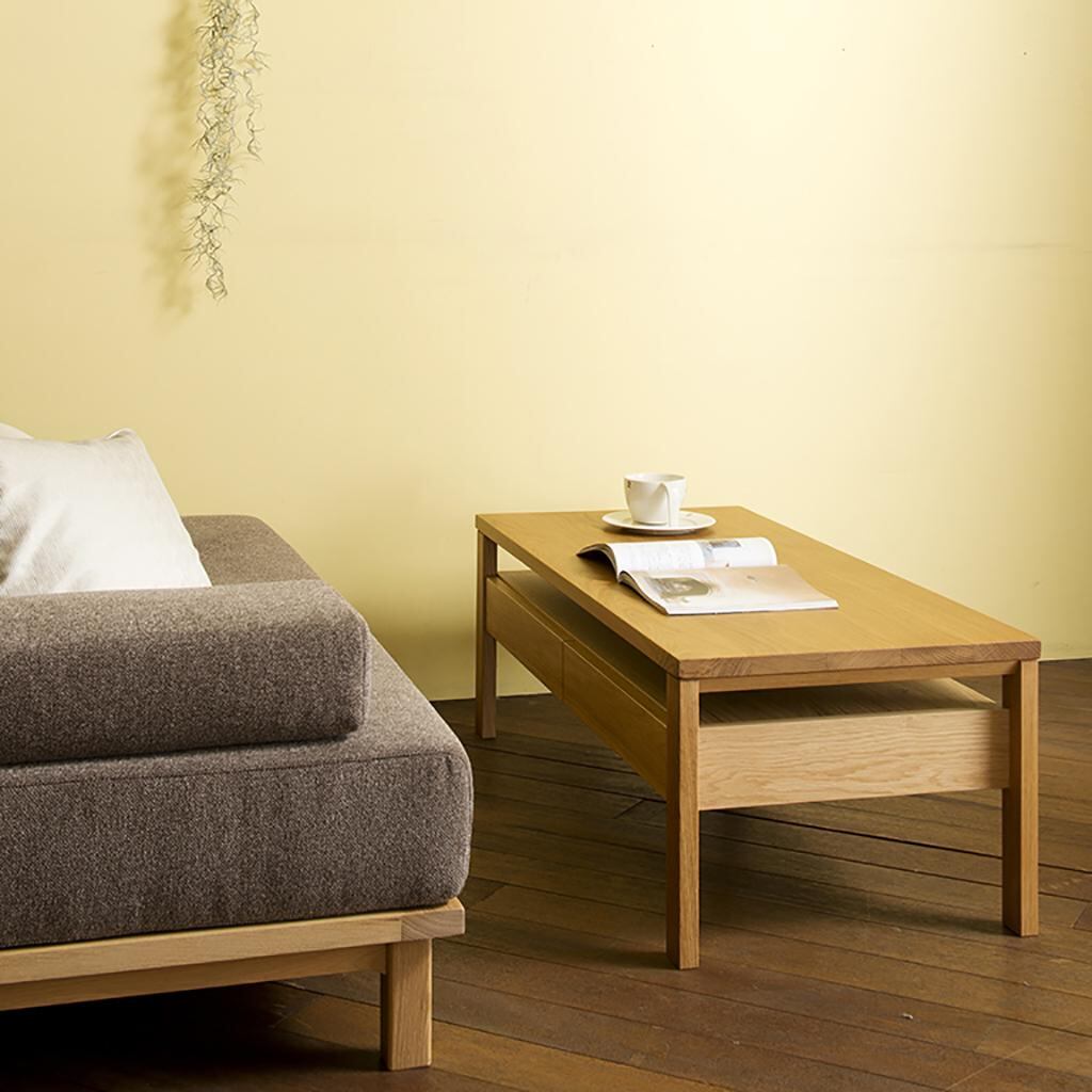 引出しと棚板付きで、煩雑になりがちなリビングまわりの小物を収納できるテーブル。