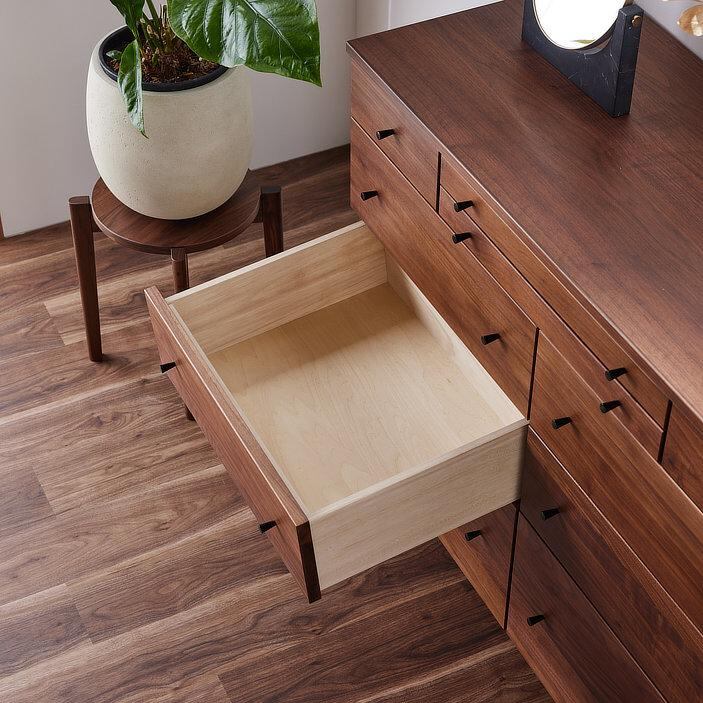 使い手の動線や収納物を想定した引き出し構成には、職人の丁寧なものづくりへのこだわりが息づいています。