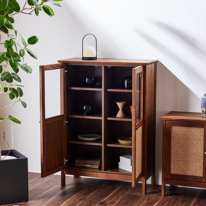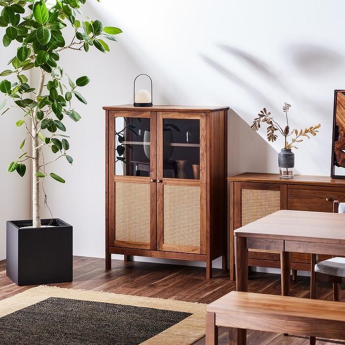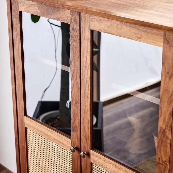 天板木口・戸枠・前板・脚には無垢材を、扉中央には籐(ラタン)をあしらい、軽やかさと上質感を両立させました。