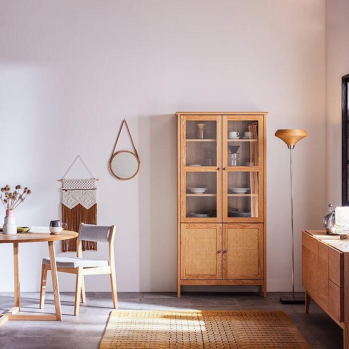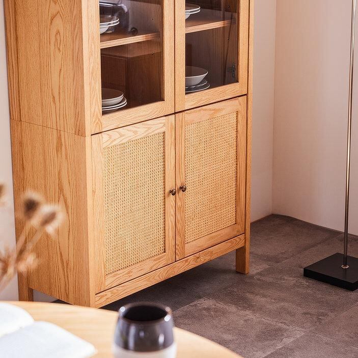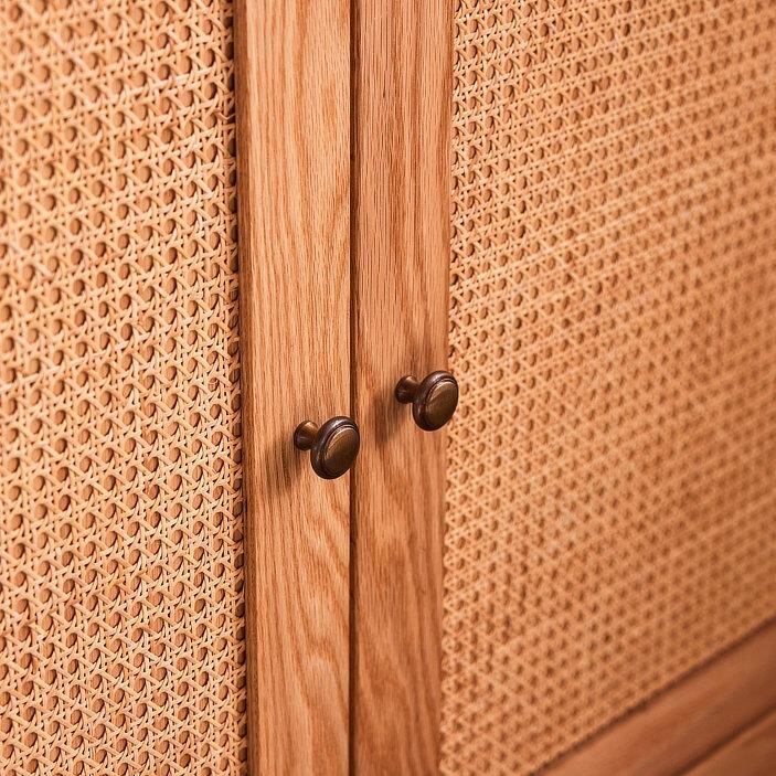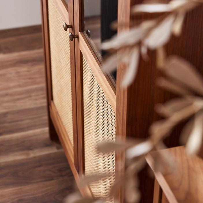 天板木口・戸枠・前板・脚には無垢材を、扉中央には籐(ラタン)をあしらい、軽やかさと上質感を両立させました。