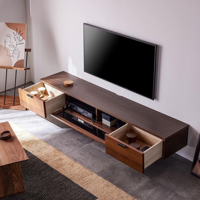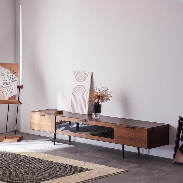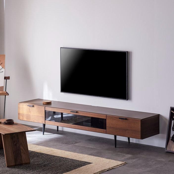 落ち着いた木目とブラックパーツの組み合わせが美しい、シンプルモダンなテレビボード。
