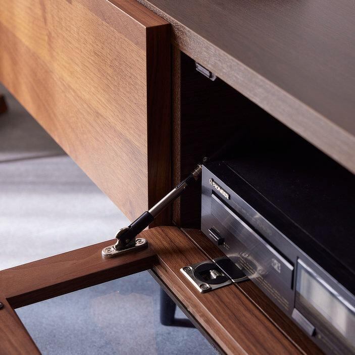 中央はガラス扉仕様で、レコーダーやゲーム機の収納に便利。