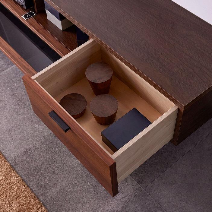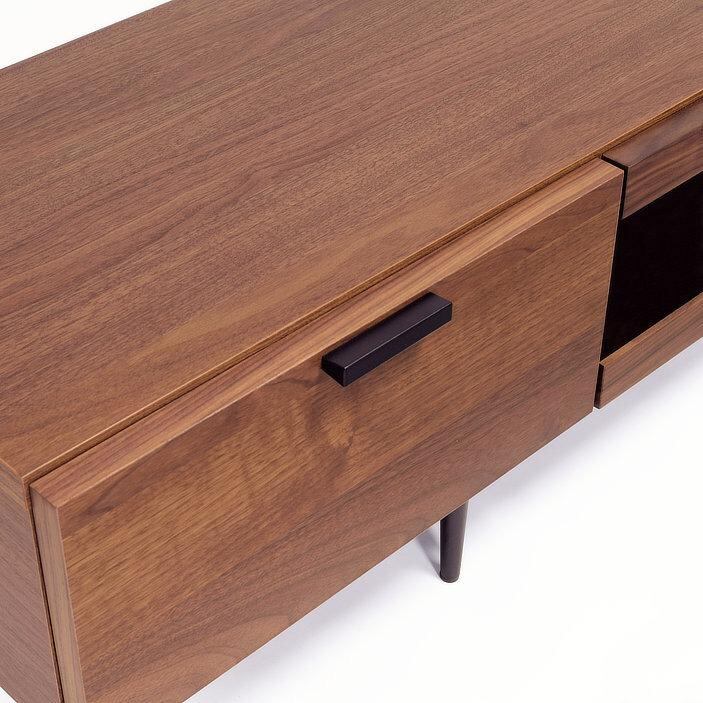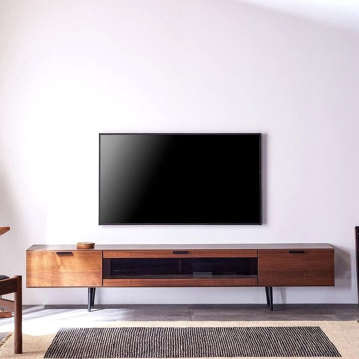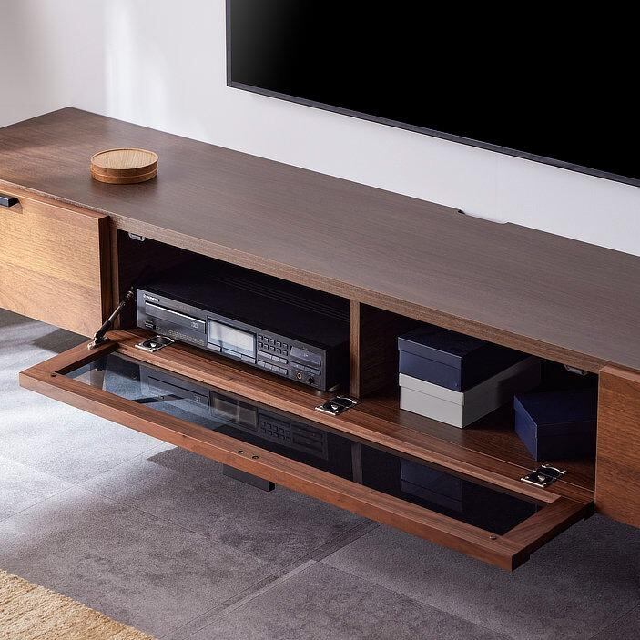 落ち着いた木目とブラックパーツの組み合わせが美しい、シンプルモダンなテレビボード。
