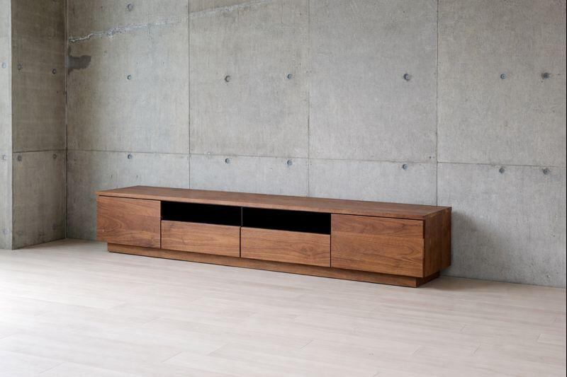無駄な装飾を排した、極めてミニマルなデザインのテレビボード。