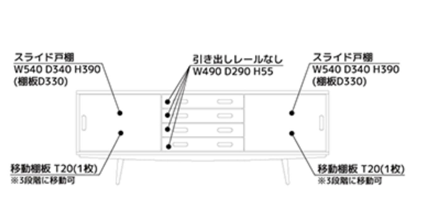 前面は 左右スライド扉+中央引き出し4杯 の収納力ある構成。