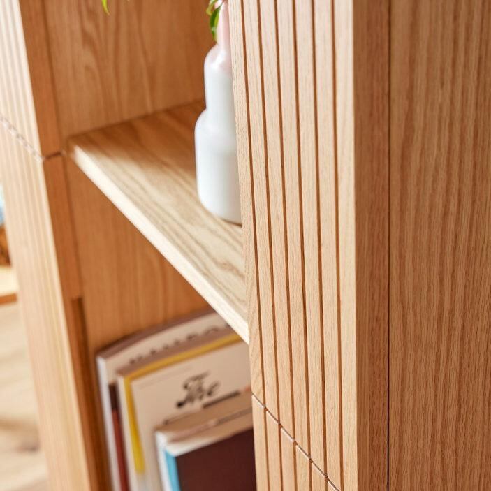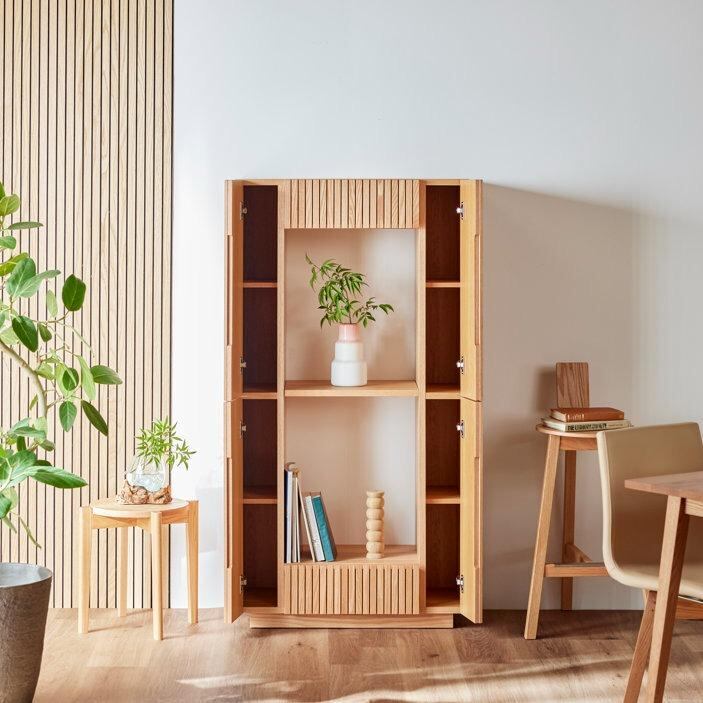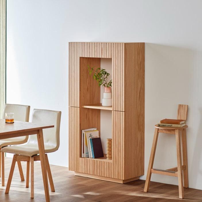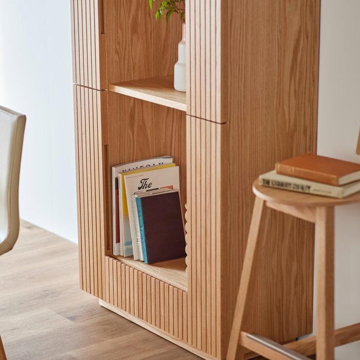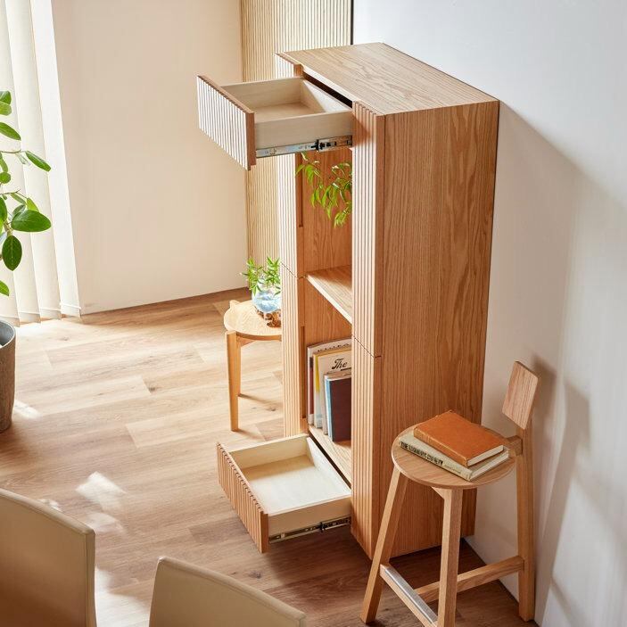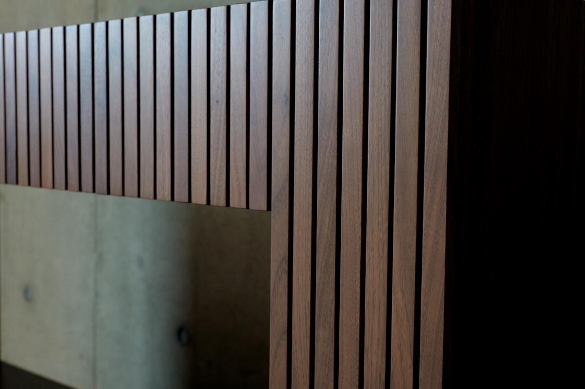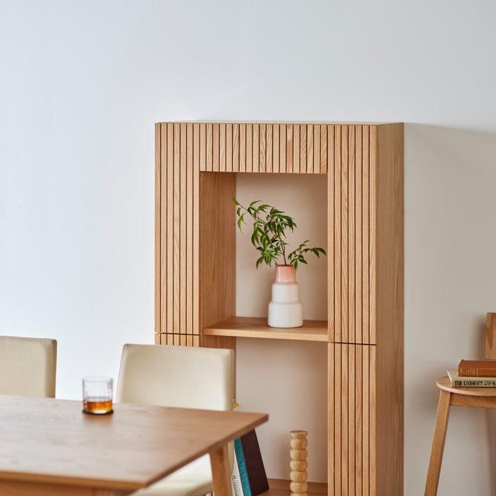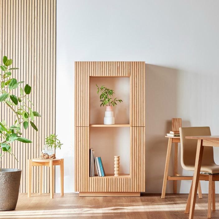 木の質感、格子の影、見せる・隠す収納のバランスが絶妙な、デザイン性と機能性を兼ね備えた収納家具です。