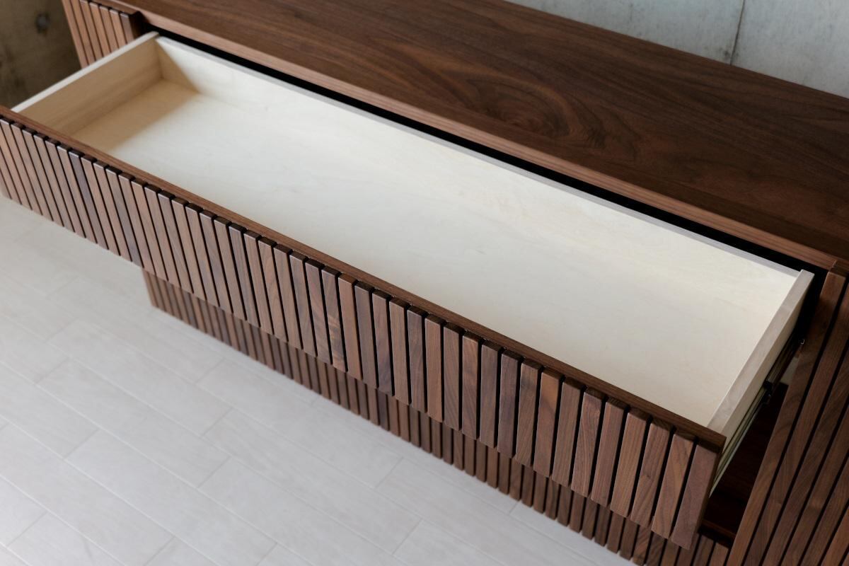 また、大容量の引き出し収納を備え、リビング周りの細かな日用品や雑貨をスマートに隠して整理できます。