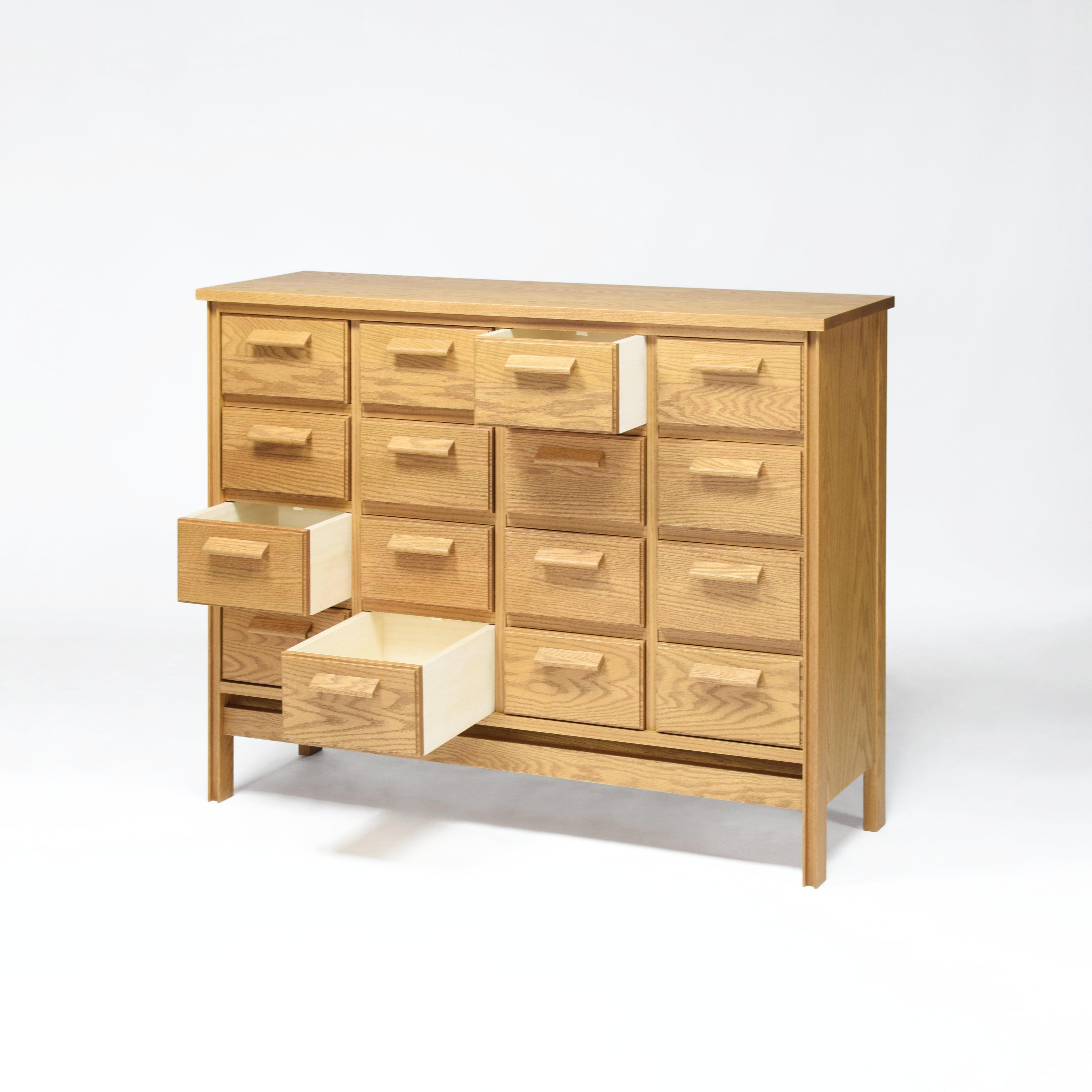 多数の小引き出しを整然と配置した、存在感ある幅120サイズのチェスト。