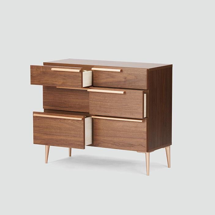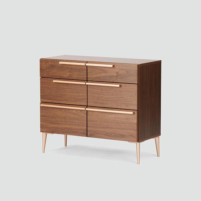 天然木の美しい木目と、カッパー色のアクセントが印象的なモダンチェスト。