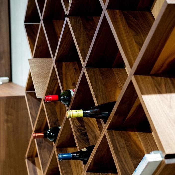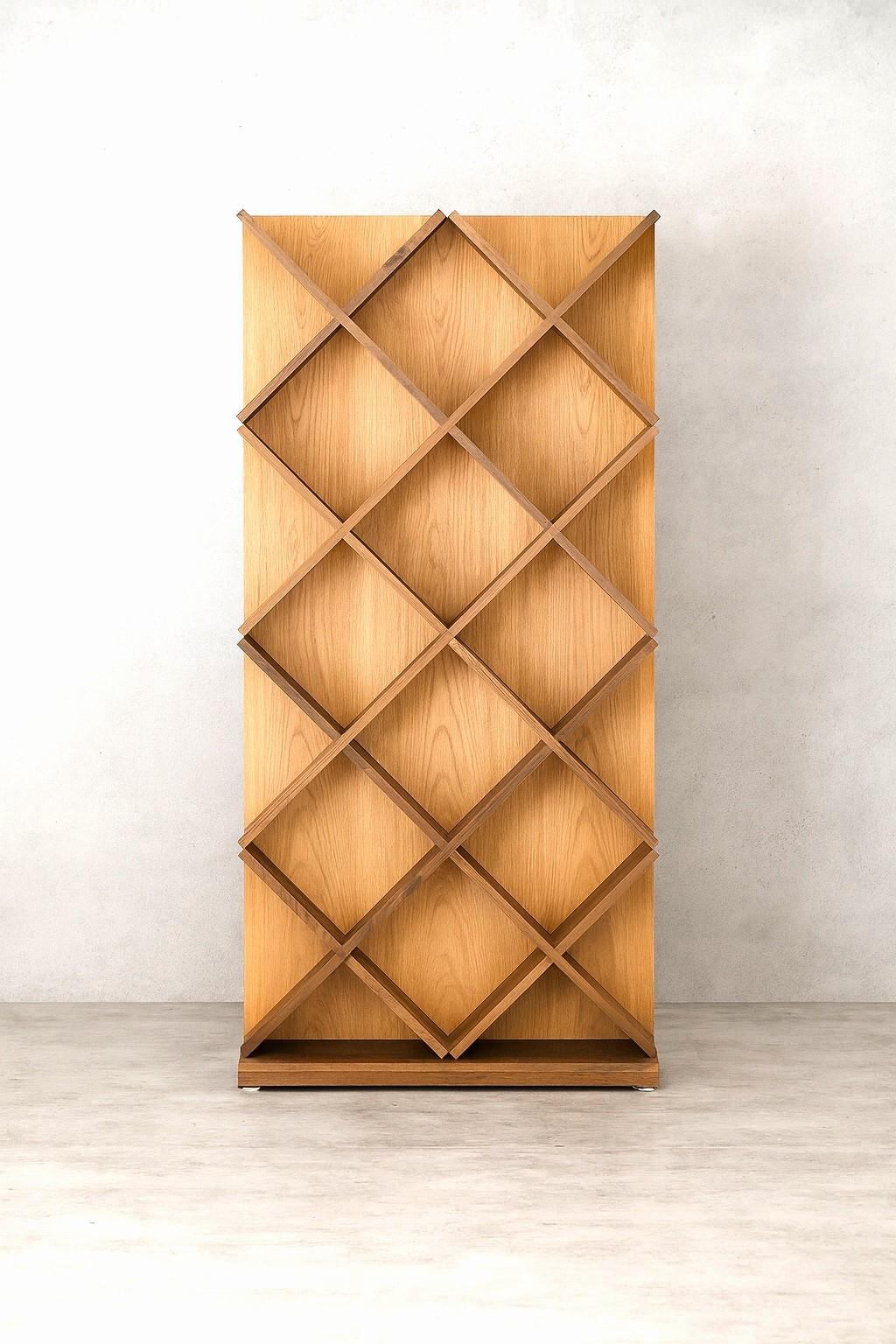 リズミカルに組まれたダイヤ形の棚が、空間に遊び心と動きを添えるデザインです。