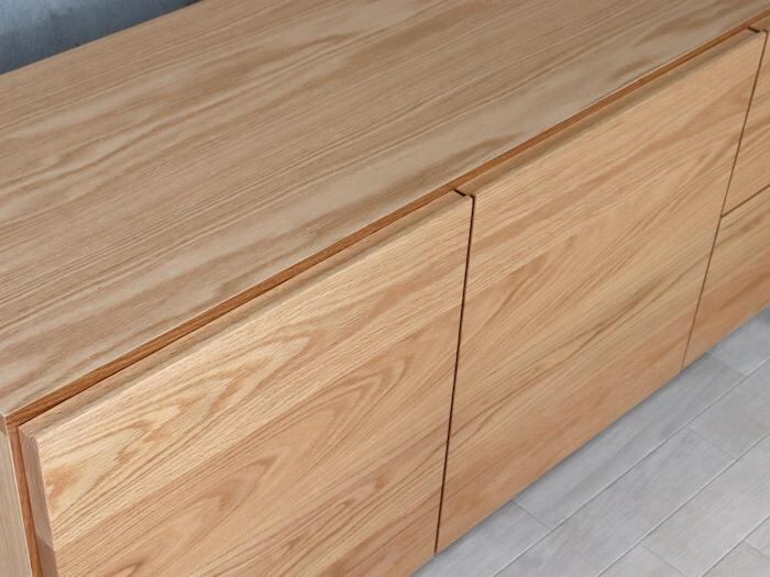 前板・脚には無垢材を、天板・側板には突板を使用。