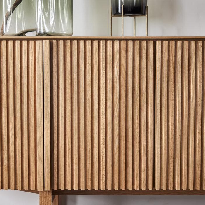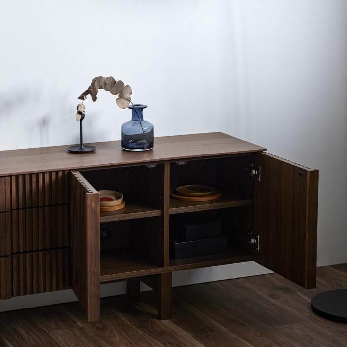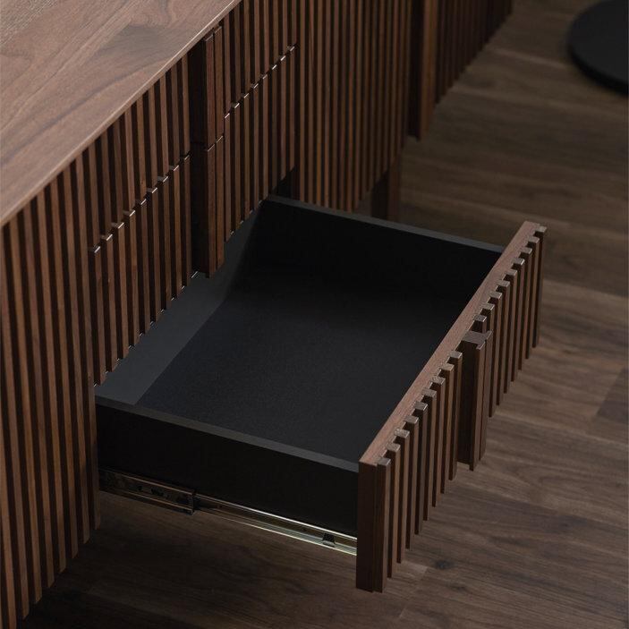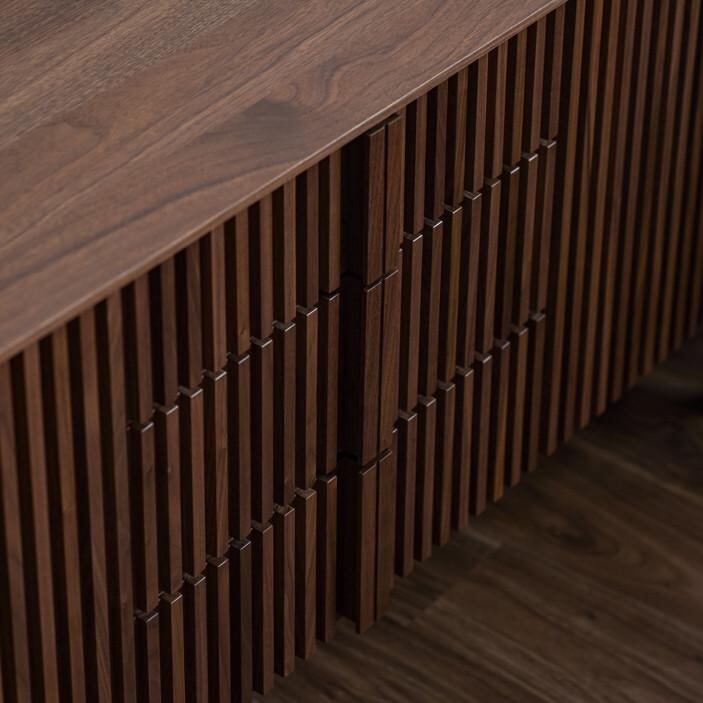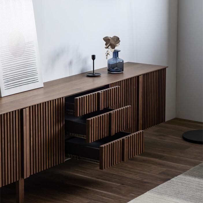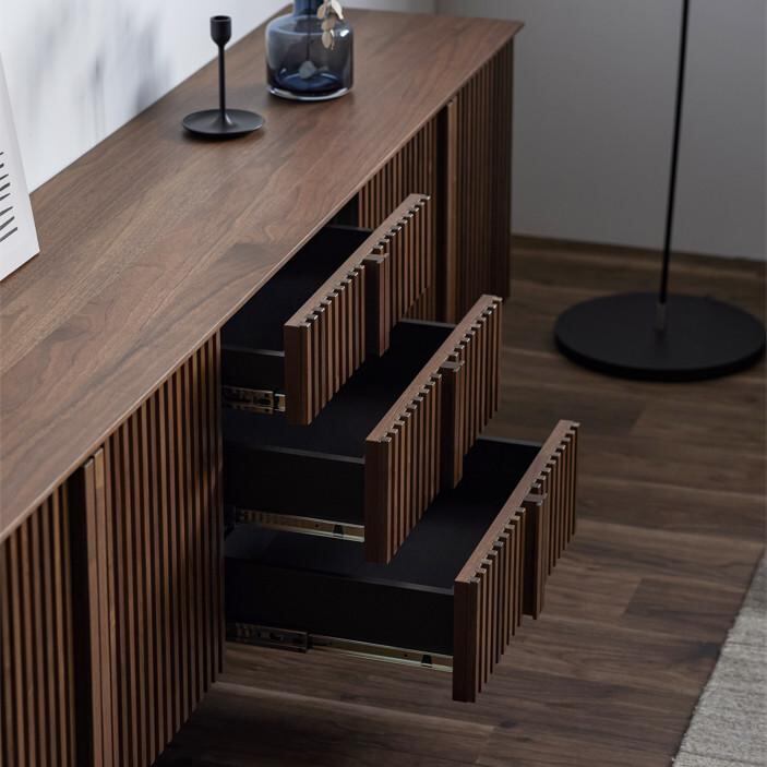 最大の魅力は、縦の桟木が描き出す端正で美しいデザインにあります。その美しさを際立たせるために、デザインの細部まで徹底的にこだわり抜きました。桟木の縦のラインをよりシャープに、美しく見せるため天板は薄く仕上げ、脚は取っ手のラインと揃えることで、視覚的な統一感と洗練された佇まいを実現しています。細部まで計算されたミニマルでモダンなデザインは、リビング空間を上質な雰囲気へと導きます。