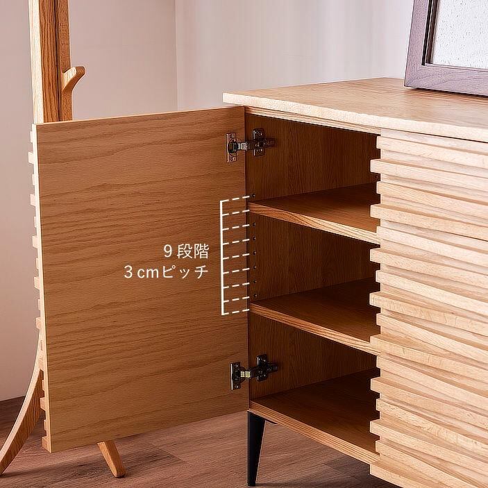 内部には細かいピッチで調整できる可動棚を備え、収納する物に合わせて柔軟にレイアウトできます。