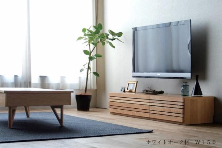シンプルなデザインだからこそ、無垢材を使った質感が際立つテレビボード。