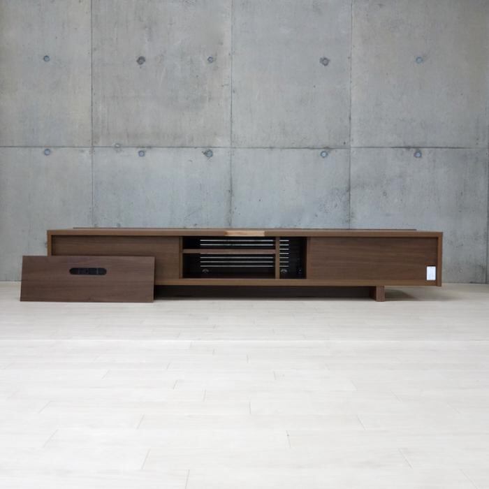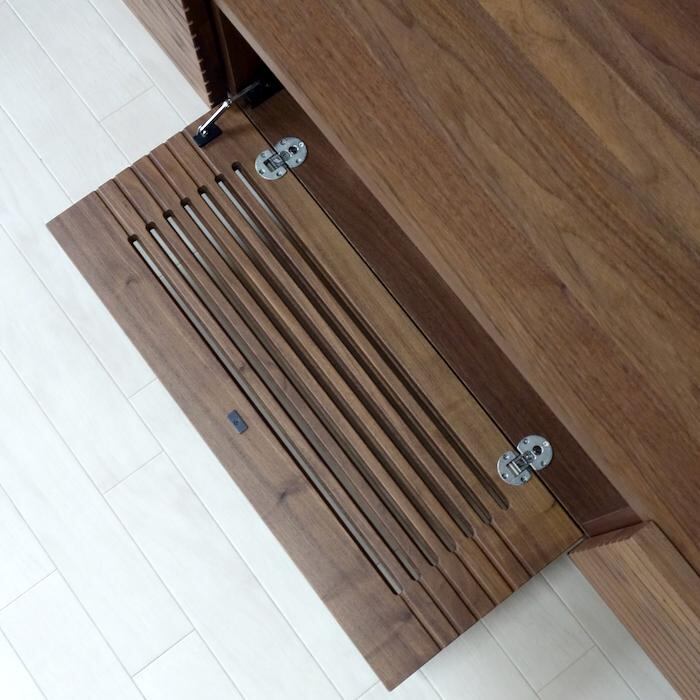 中央のAV収納はゆっくりひらくフラップ扉。中央の前板には格子に隙間を設けることで、扉を閉じたままリモコン操作が可能に。