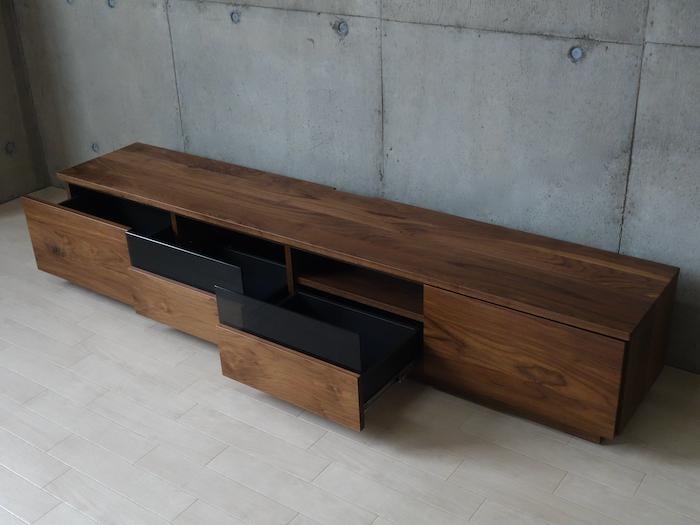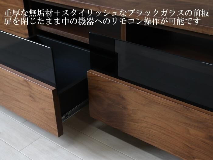 AV収納の引出しはスタイリッシュなブラックガラスを使用。