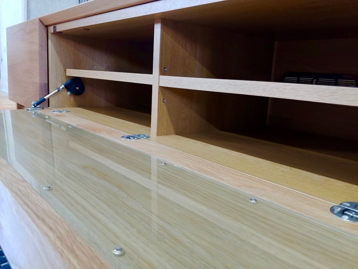 そのため、外観は木材のように見えますが、収納した機器をリモコンで操作できます。
