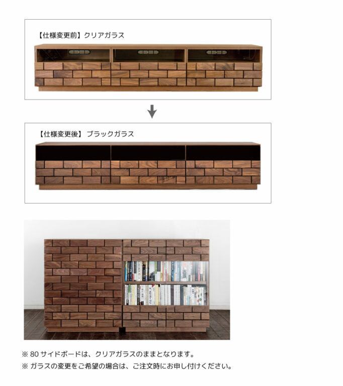 CLASSE人気シリーズ「ブロッコ」のTVボード。角材の組み合わせがリズム感を生み出し、前板に表情を与えたリビングシリーズ。絵になる存在感が魅力で、一つ一つ手作業で削られた角材には、職人の思いが込められています。前面のガラスは同価格で黒ガラスに変更できます(黒ガラスに変更した場合、受注生産となりますので納期が1ヶ月〜2ヶ月かかります)。
