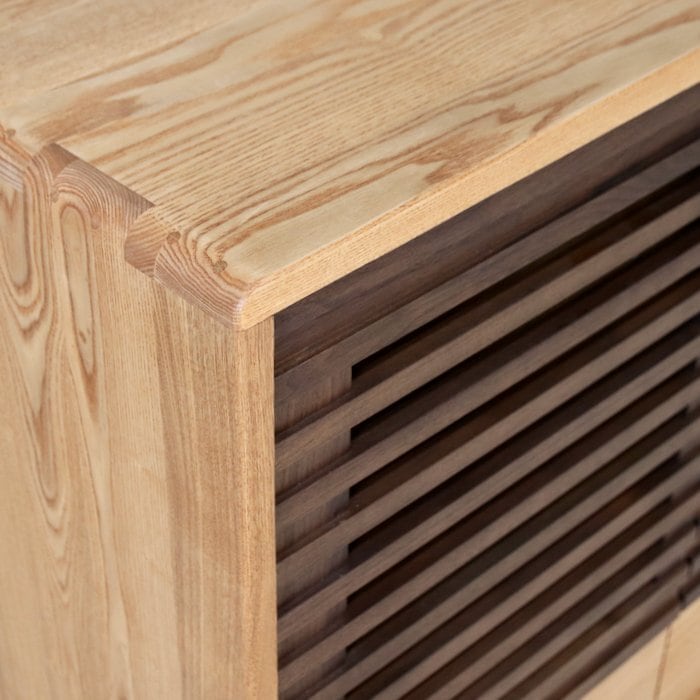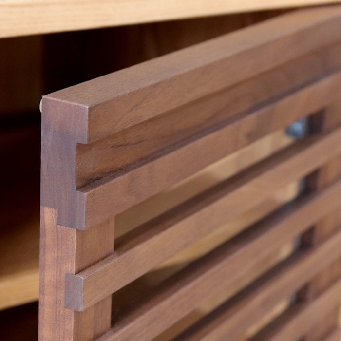 格子状にしたウォールナット無垢材の扉が特徴的で、凛としたたたずまいで、中の物を程よく目隠ししてくれます。