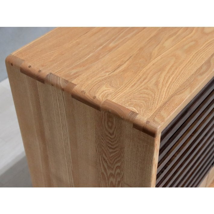 当オンラインショップで大人気の無垢材 匠デザイン 結シリーズのサイドボードをご紹介します。このサイドボードは、天然木の無垢材を使用しており、自然な風合いが魅力です。ナチュラルな木目や質感がお部屋に暖かみと上質感を与えます。天板の角を丁寧に削り丸く仕上げているので、安全性がありますし、全体的にやさしい雰囲気が感じられます。