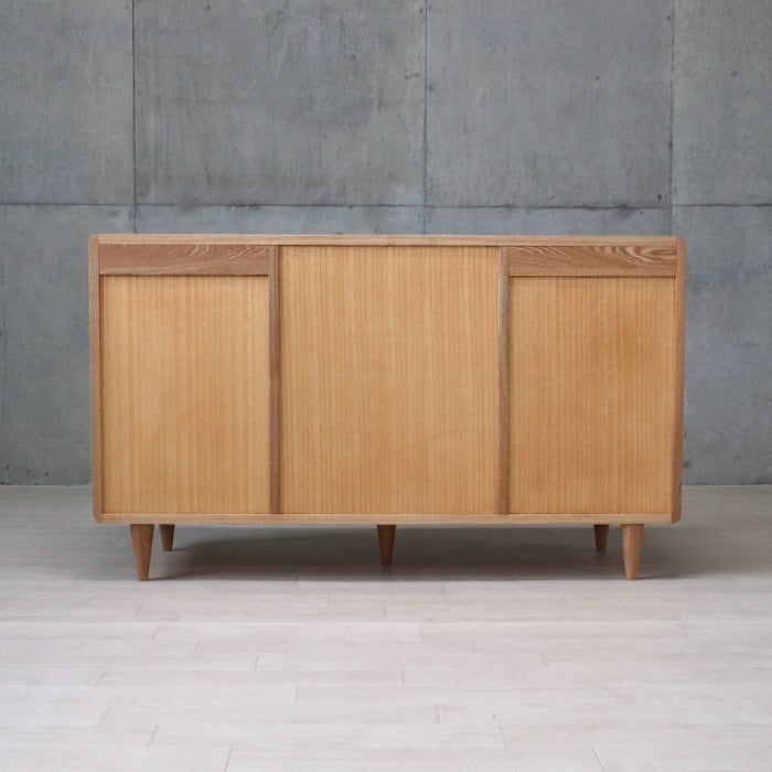 当オンラインショップで大人気の無垢材 匠デザイン 結シリーズのサイドボードをご紹介します。このサイドボードは、天然木の無垢材を使用しており、自然な風合いが魅力です。ナチュラルな木目や質感がお部屋に暖かみと上質感を与えます。天板の角を丁寧に削り丸く仕上げているので、安全性がありますし、全体的にやさしい雰囲気が感じられます。