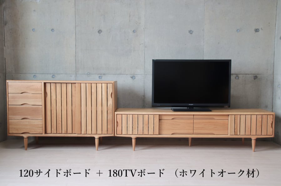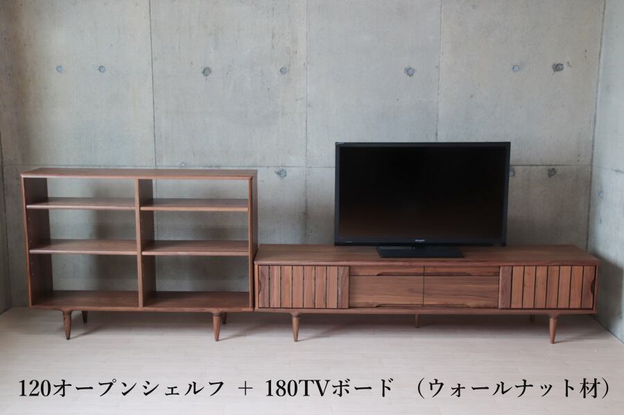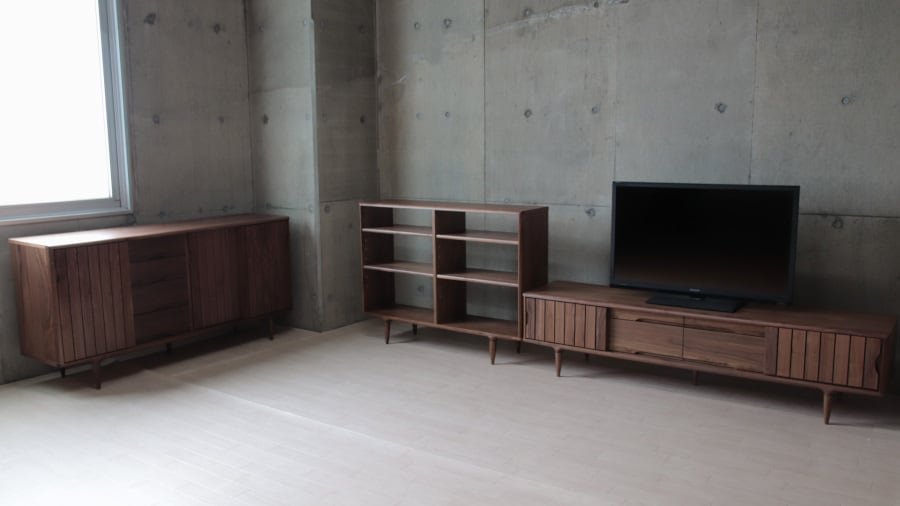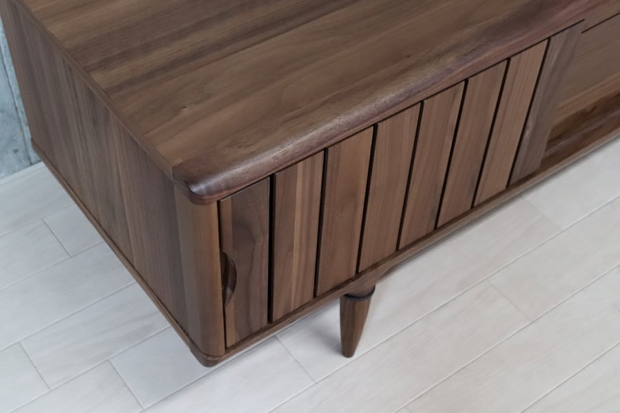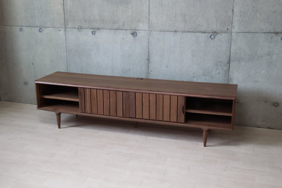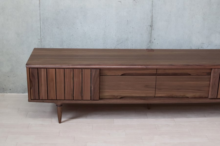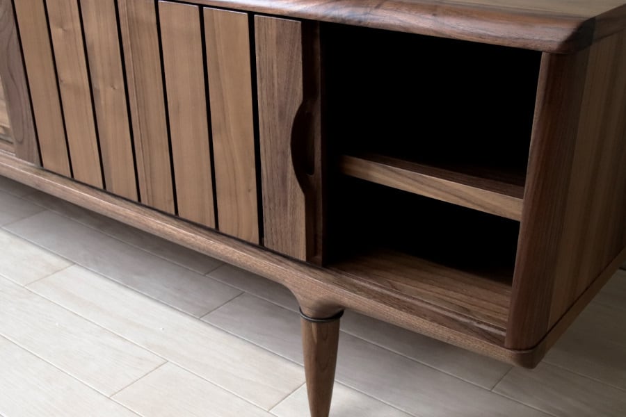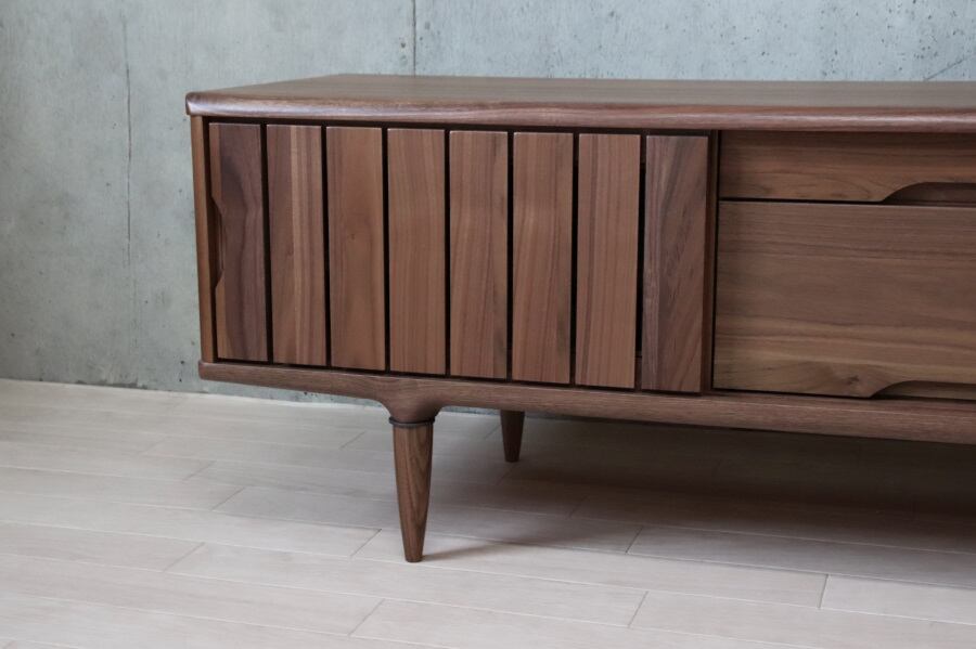 本体面材、引き戸にウォールナット無垢材を使用した、丸脚・引き戸タイプが特徴的なおしゃれで本格的なテレビボード