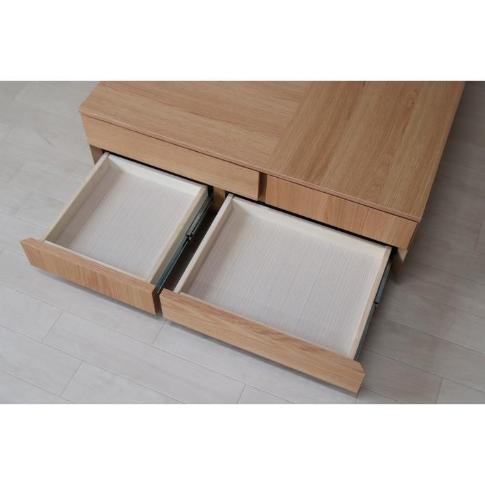 表の収納は、引き出しを四つに分けております。眼鏡や新聞、リモコンなどの整理もしやすい仕様です。