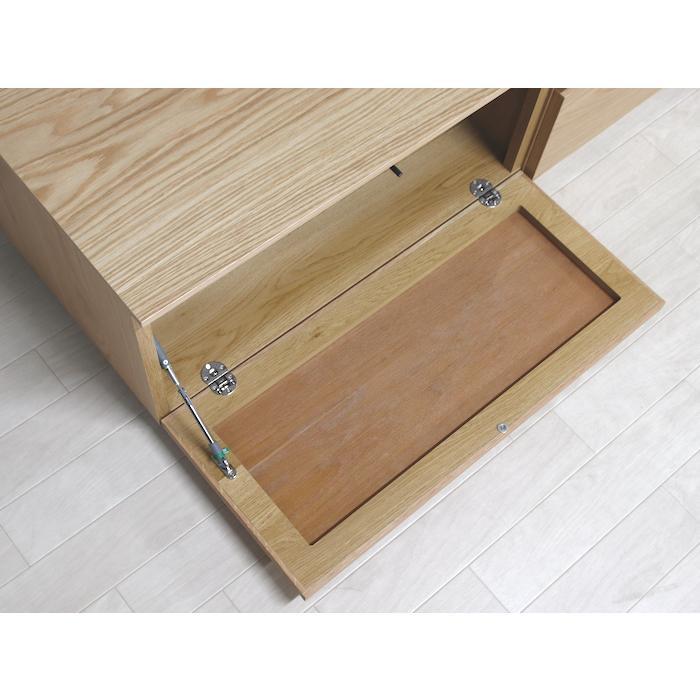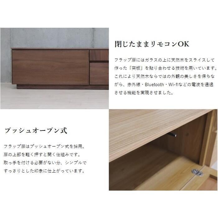 フラップ扉の前板は突板+ガラスを採用し、天然木の風合いは損なわずに、リモコンが通るような機能性も持っています。