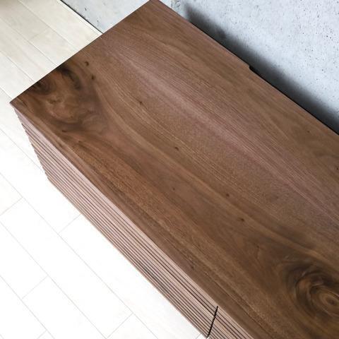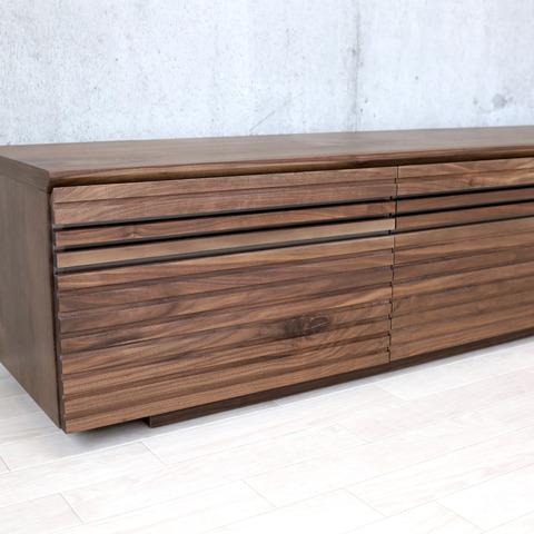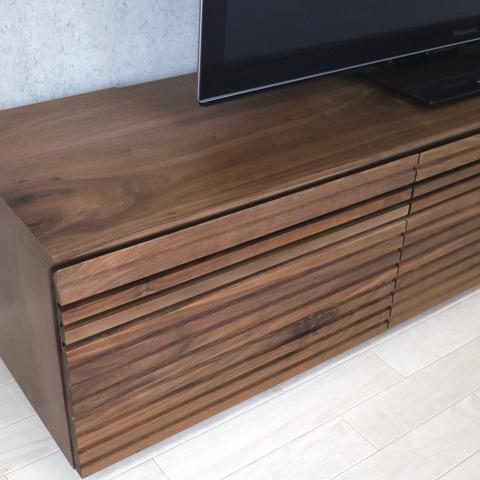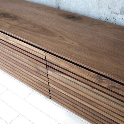 無垢の板材を削り込み、横方向の意匠を出したテレビボードです。
