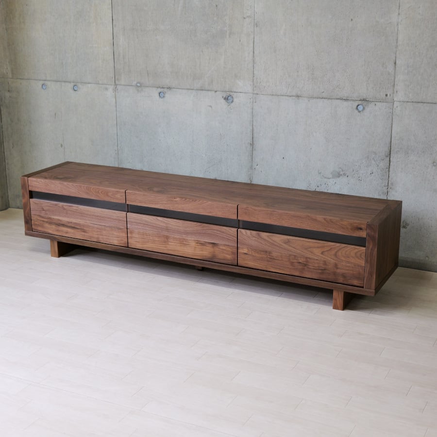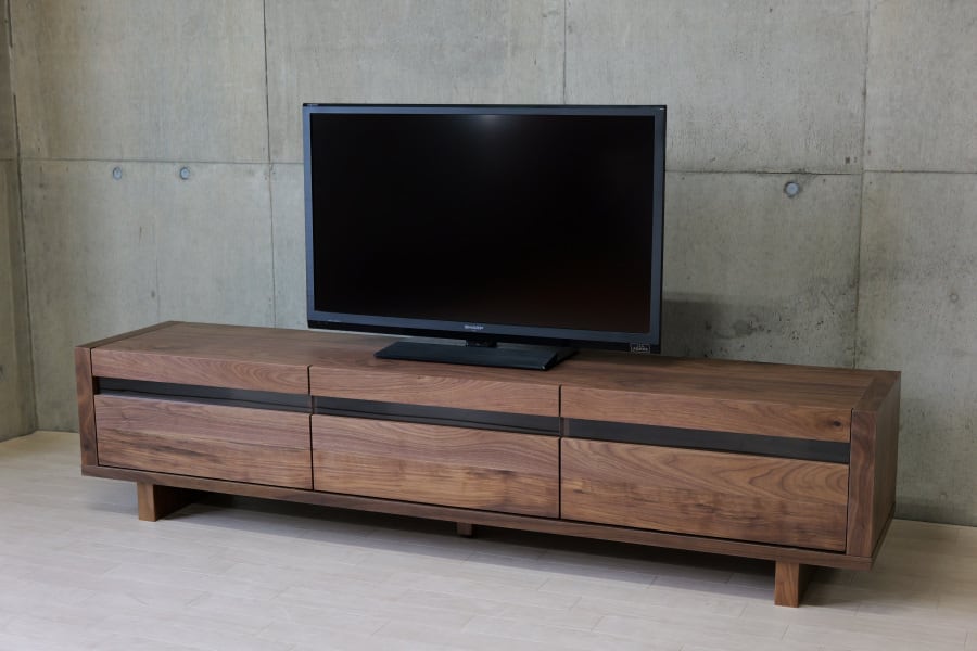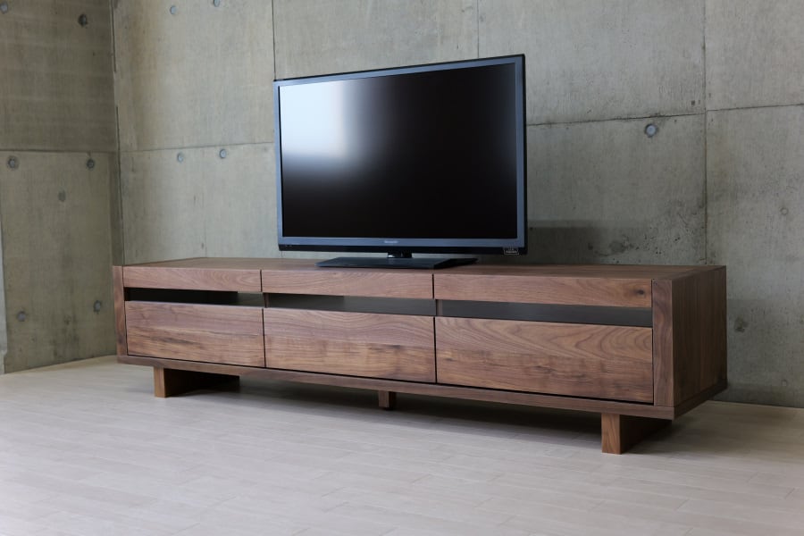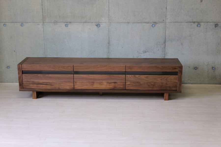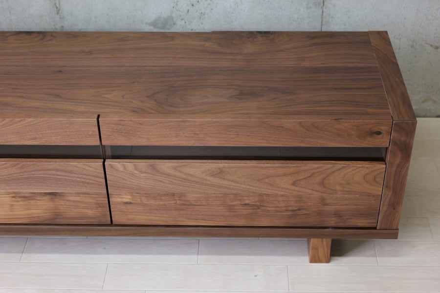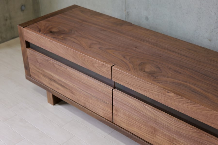 前板に無垢材を木目通しで用いて、厚みのある脚を用いたテレビボードです。本体や脚の面材にも無垢を使い、正面からの印象をより良く仕上げています。引き出しの上部にはそれぞれデッキ収納が可能なスペースを配し、接続を簡易にするため背面はオープンにしています。コード配線をすっきりできるように、天板、敷台にサクリ加工を施しています。ガラスには飛散防止フィルムを貼ったブロンズガラス(強化)を用いて、デザイン性と機能性を両立させています。