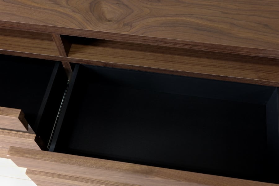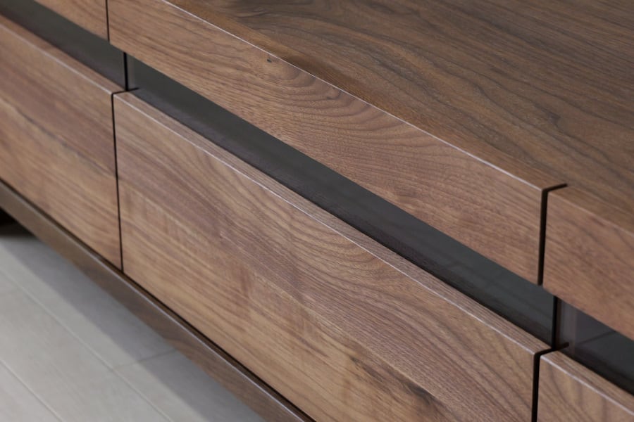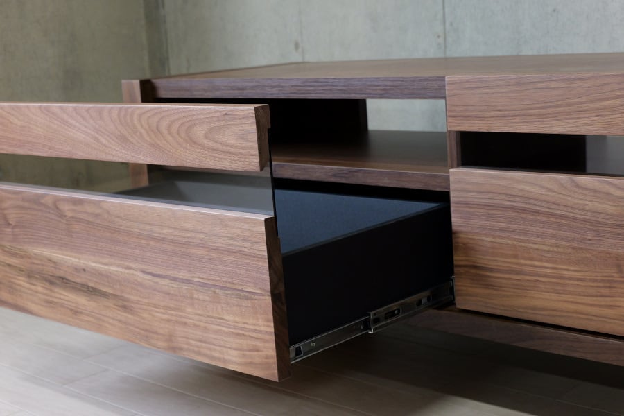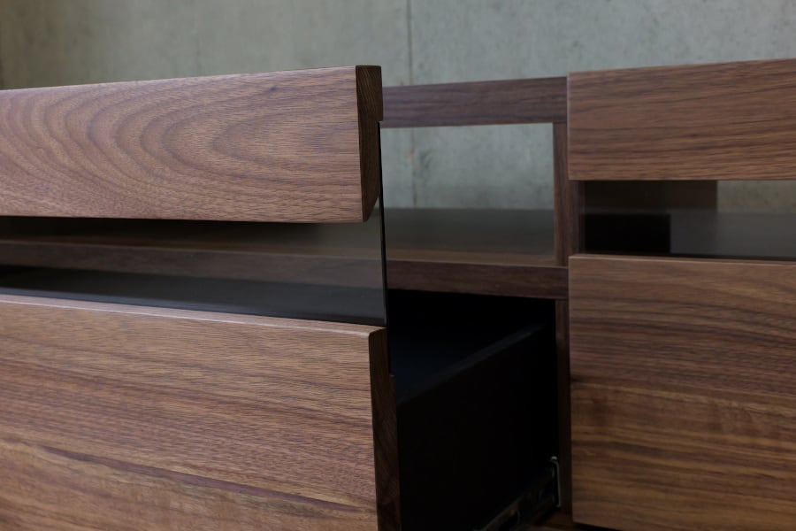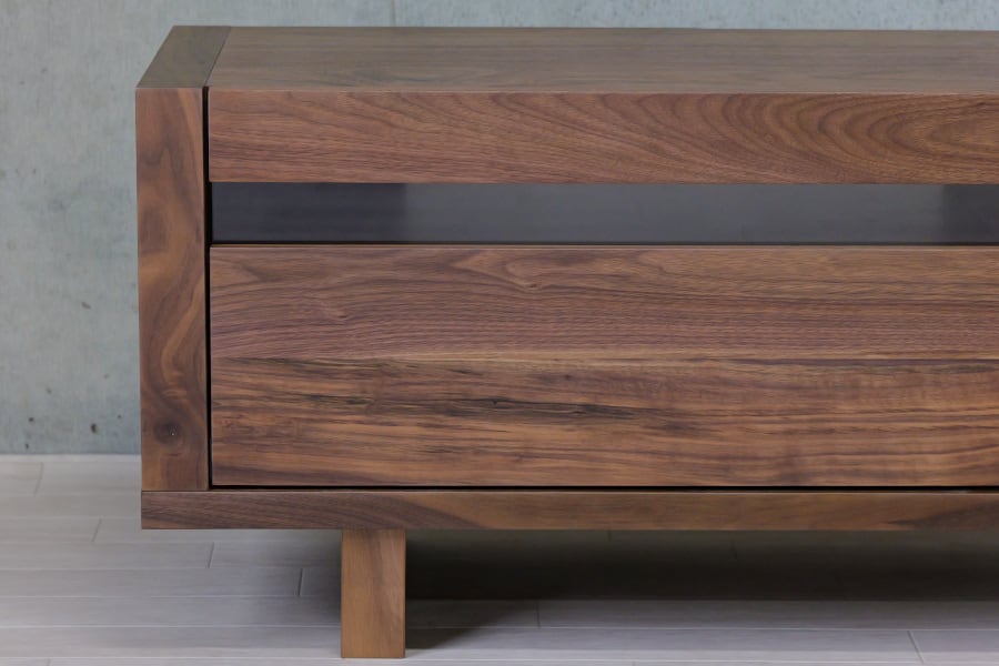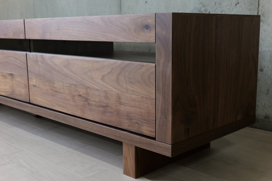 前板に無垢材を木目通しで用いて、厚みのある脚を用いたテレビボードです。本体や脚の面材にも無垢を使い、正面からの印象をより良く仕上げています。引き出しの上部にはそれぞれデッキ収納が可能なスペースを配し、接続を簡易にするため背面はオープンにしています。コード配線をすっきりできるように、天板、敷台にサクリ加工を施しています。ガラスには飛散防止フィルムを貼ったブロンズガラス(強化)を用いて、デザイン性と機能性を両立させています。
