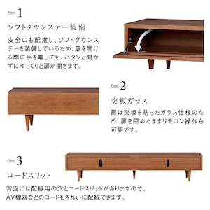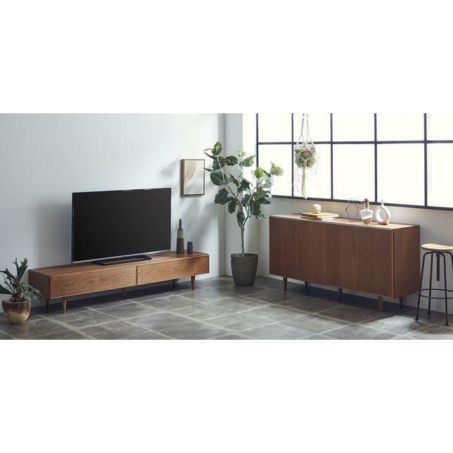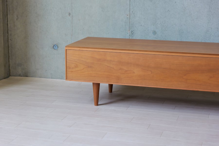 ヴィンテージ家具にもちいられるデザインとカラーを、日本国内の工場とチェリー材をもちいて再構築しました。円錐型の無垢脚により、軽やかな印象です。前板には突板ガラスを採用しているため、扉をとじた状態でリモコン操作が可能となっています。