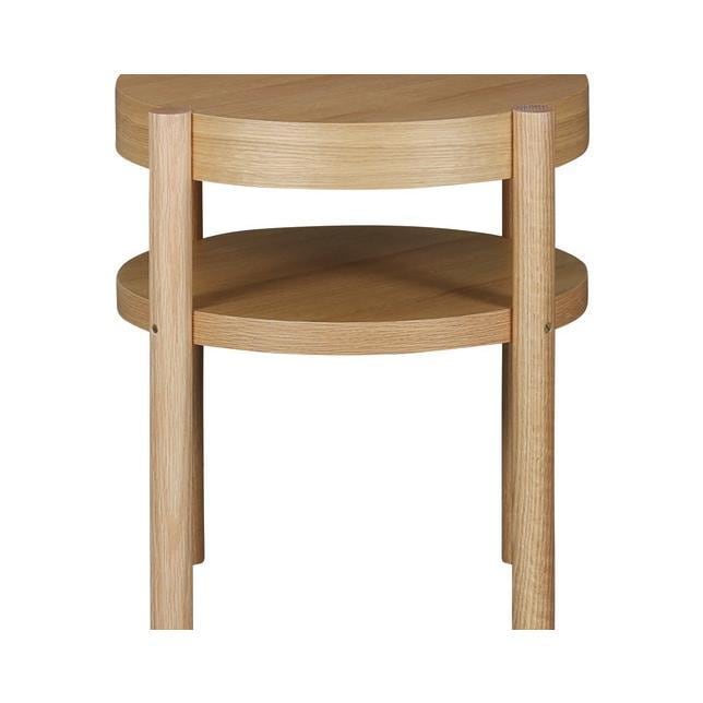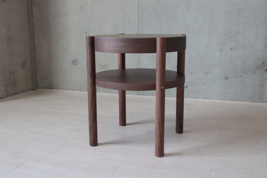 デザインポイントに6センチの天板をもちいたサイドテーブルです。丸脚との設置面は全て丸型に削り込みを行った手の込んだ仕様です。下の棚には真鍮製のマイナスネジをもちいることでアクセントにしています。同シリーズのセンターテーブルとの組み合わせもおすすめです。