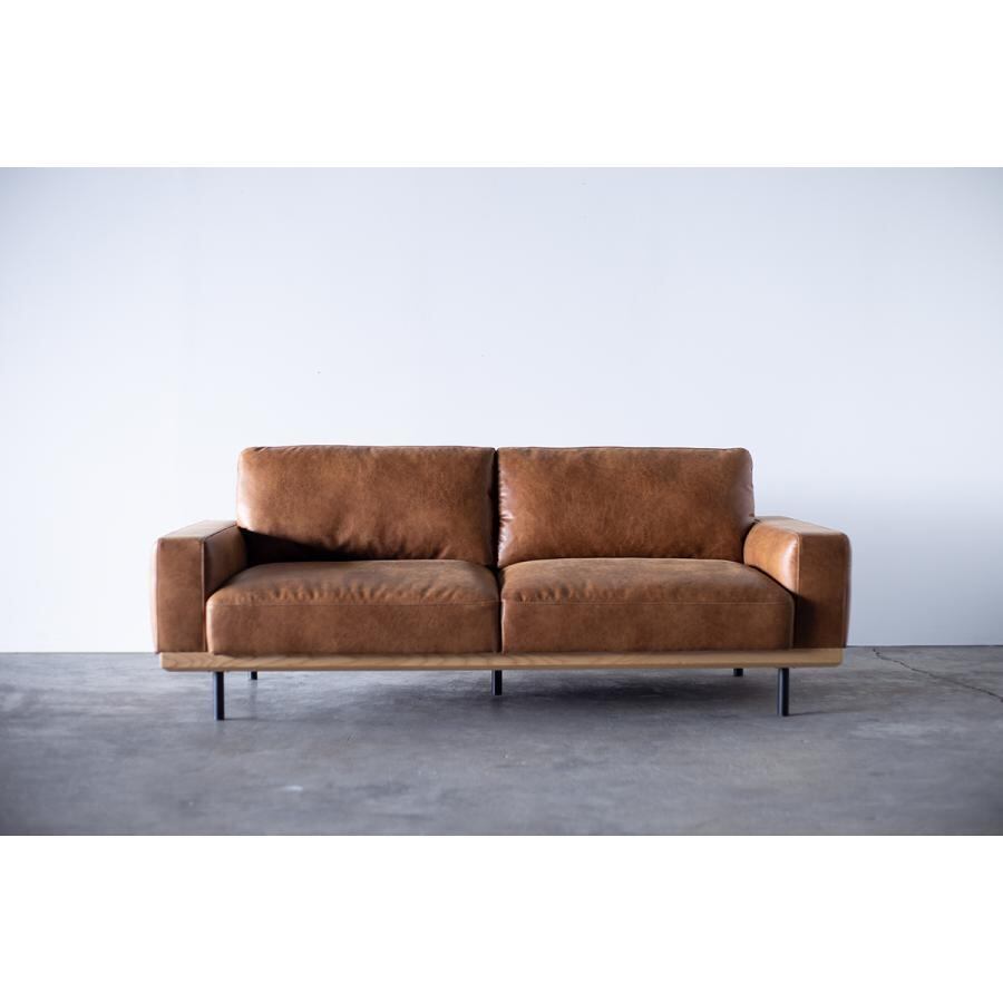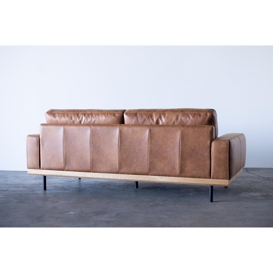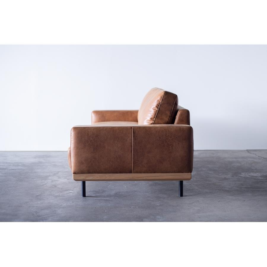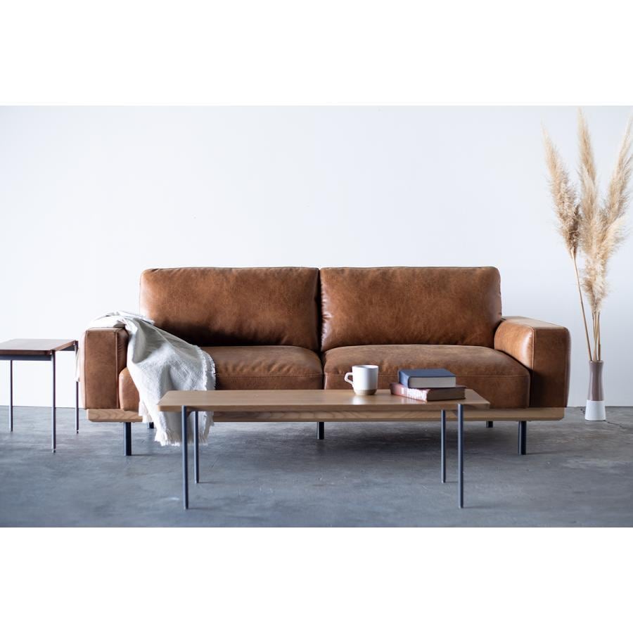 ボリュームのあるクッションに、すっきりとした脚元の木とスチールが