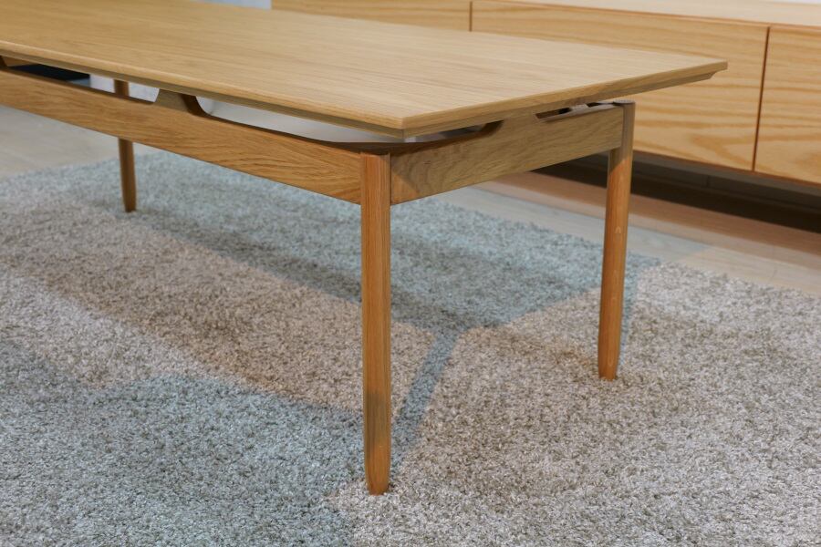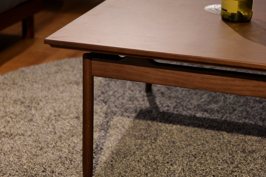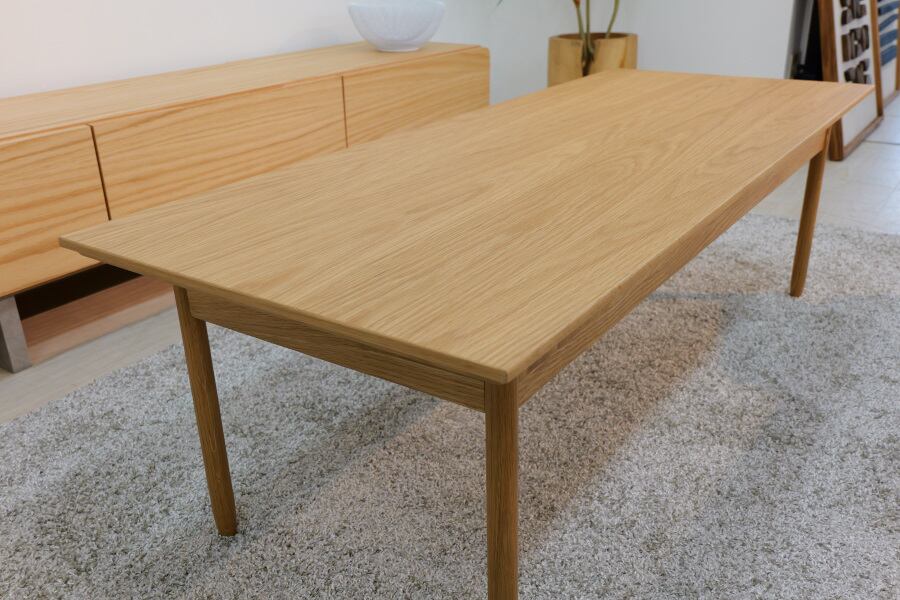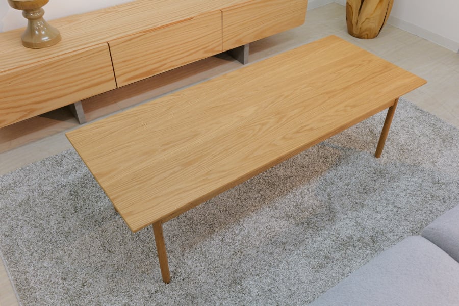 天板を浮いているように見せる特徴的な幕板デザインのリビングテーブル。