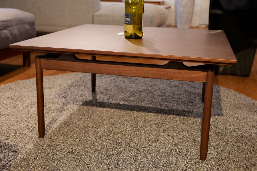 天板を浮いているように見せる特徴的な幕板デザインのリビングテーブル。