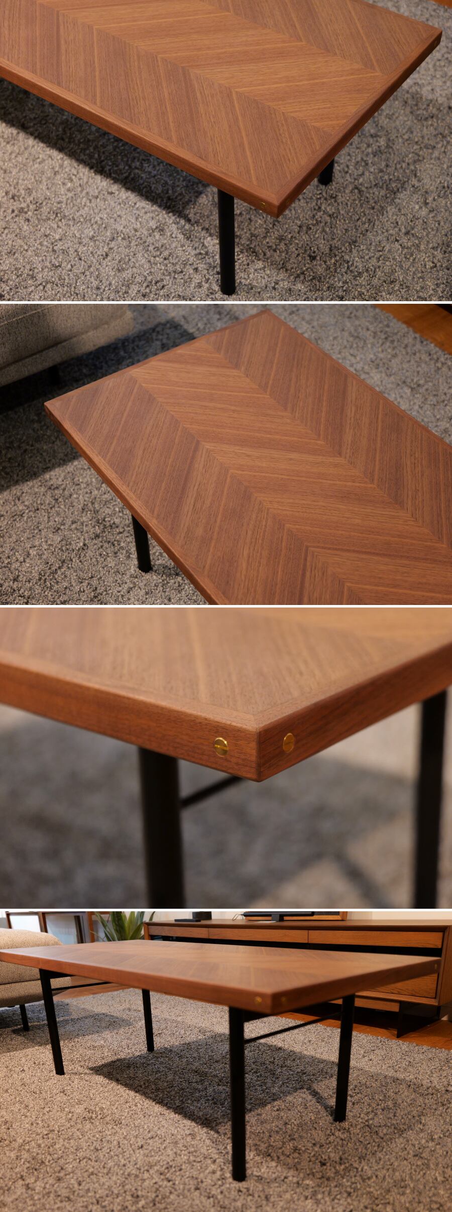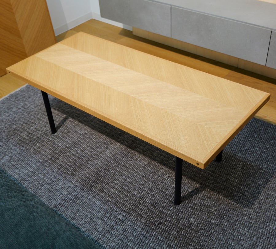 天板を浮いているように見せる特徴的な幕板デザインのリビングテーブル。