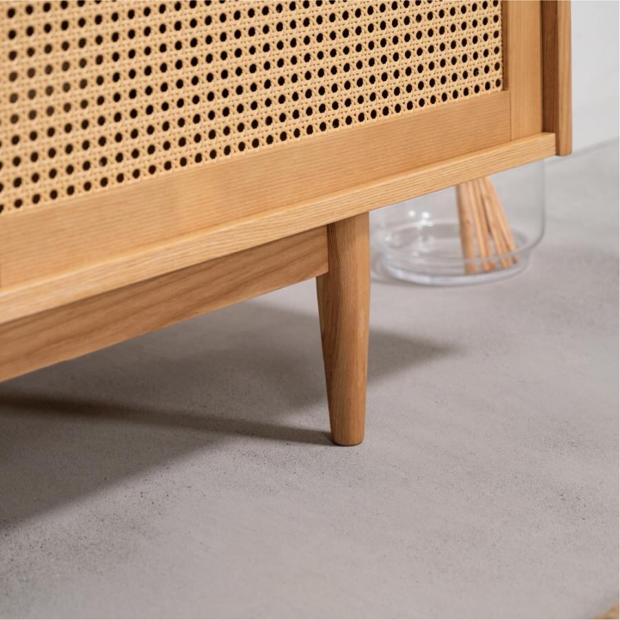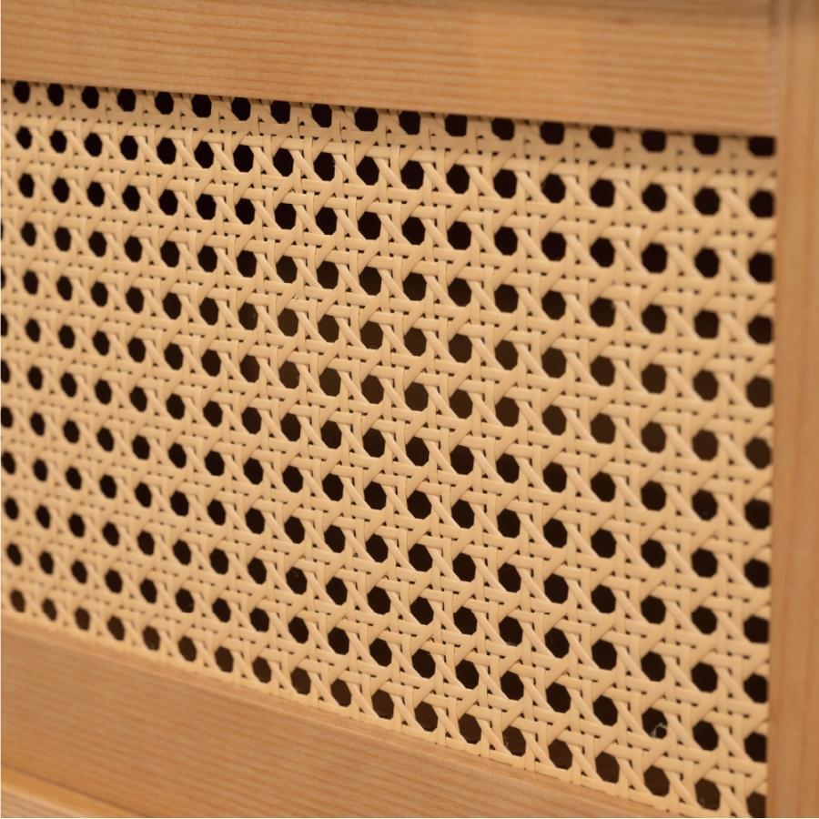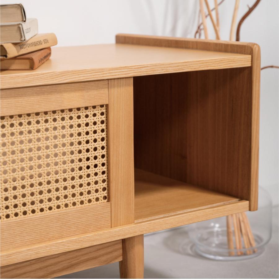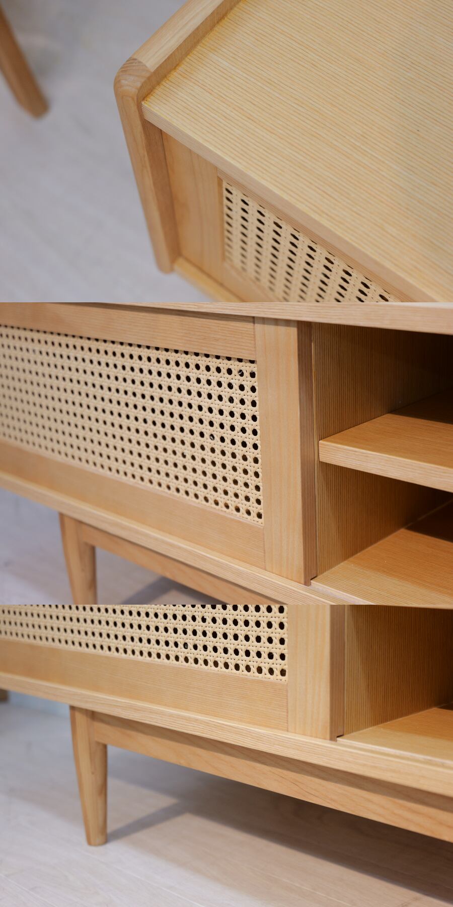 アッシュ材のカラーとマッチする人口ラタン素材をセレクトし、引き戸は木枠の段差を利用しスライド開閉させることで取手をなくしました。