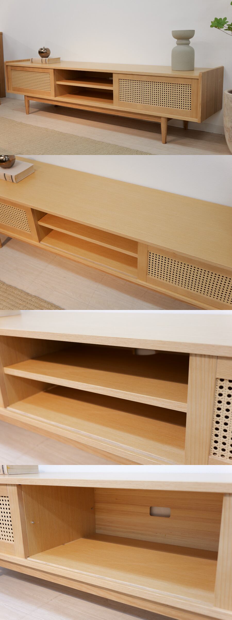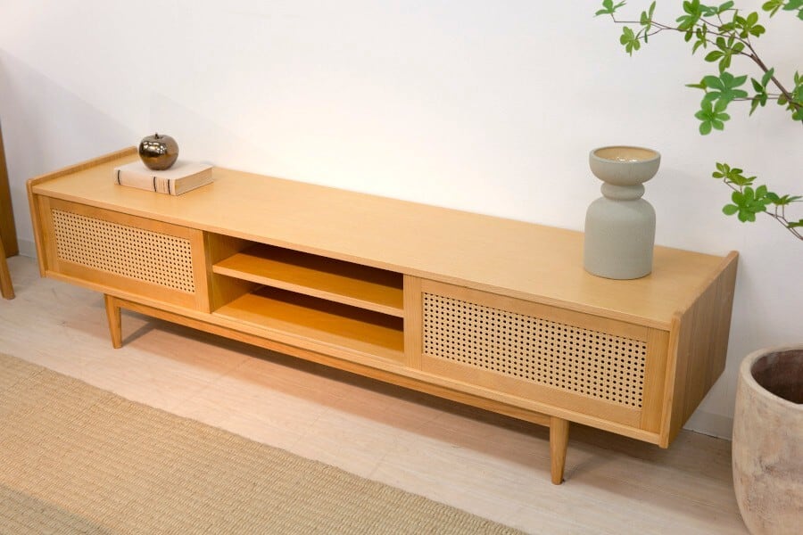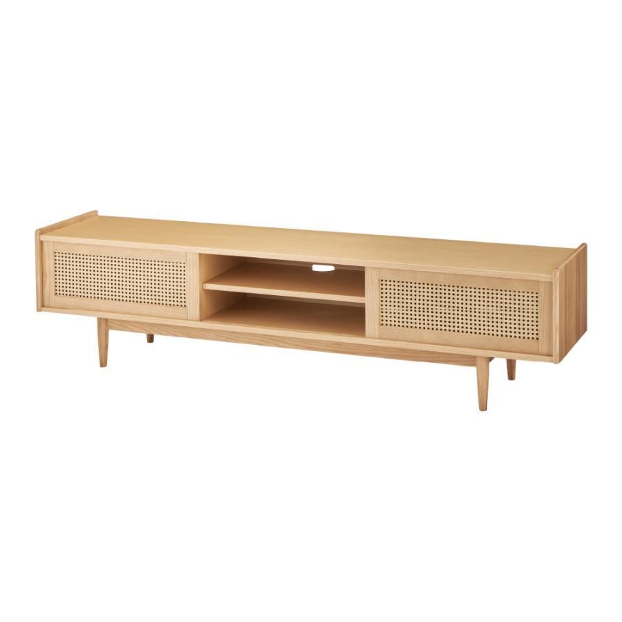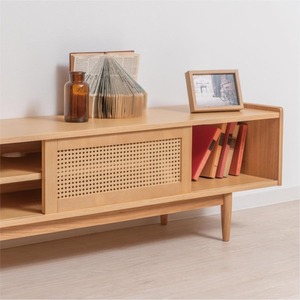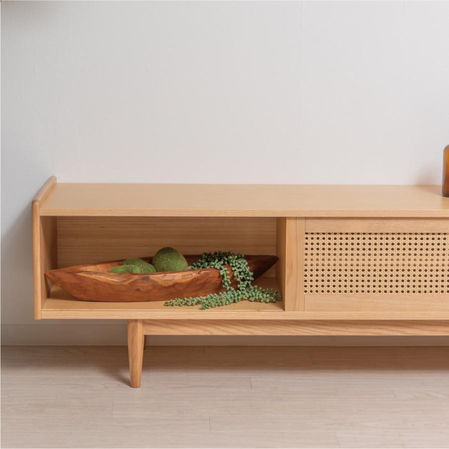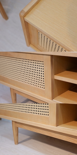 かごめ編みをアクセントに、シンプルでありながら目を引くフォルムに仕上げたTVボード。