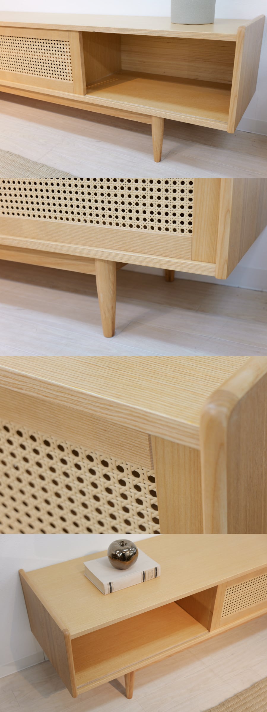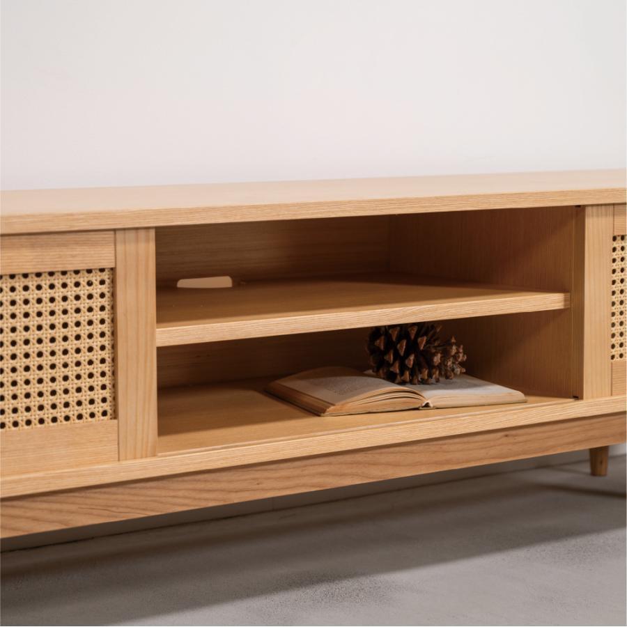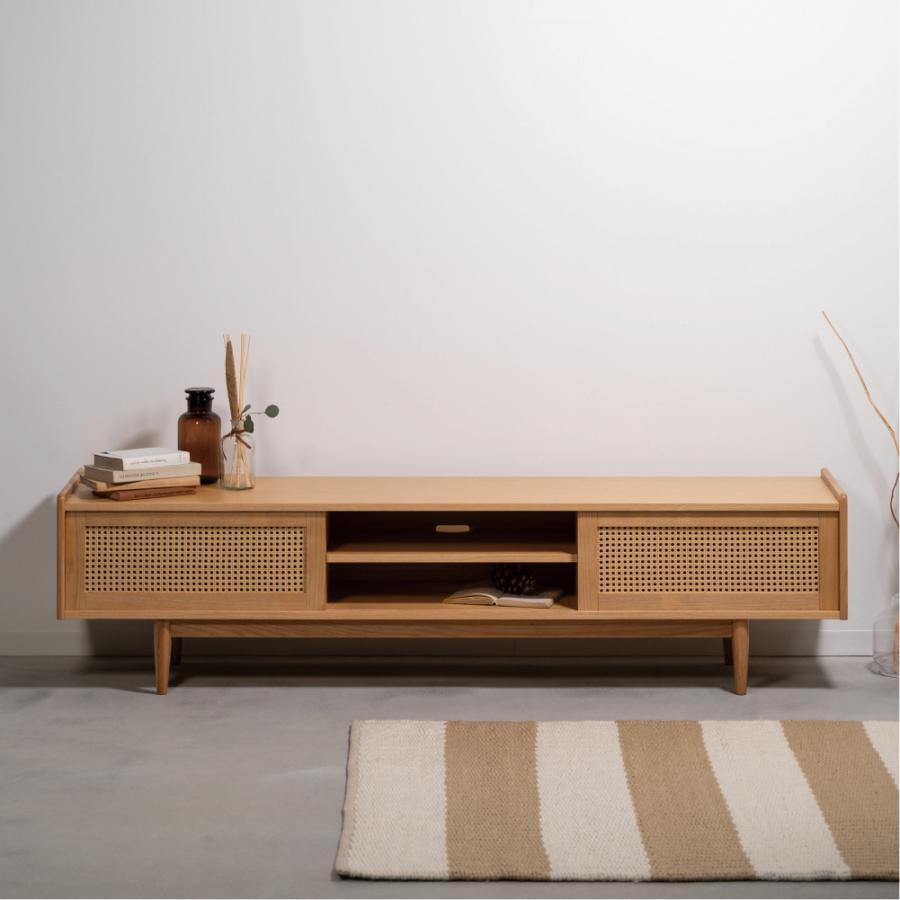 かごめ編みをアクセントに、シンプルでありながら目を引くフォルムに仕上げたTVボード。