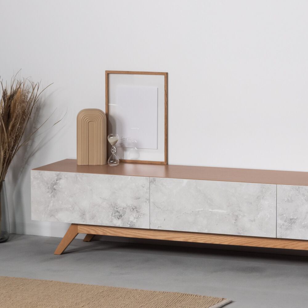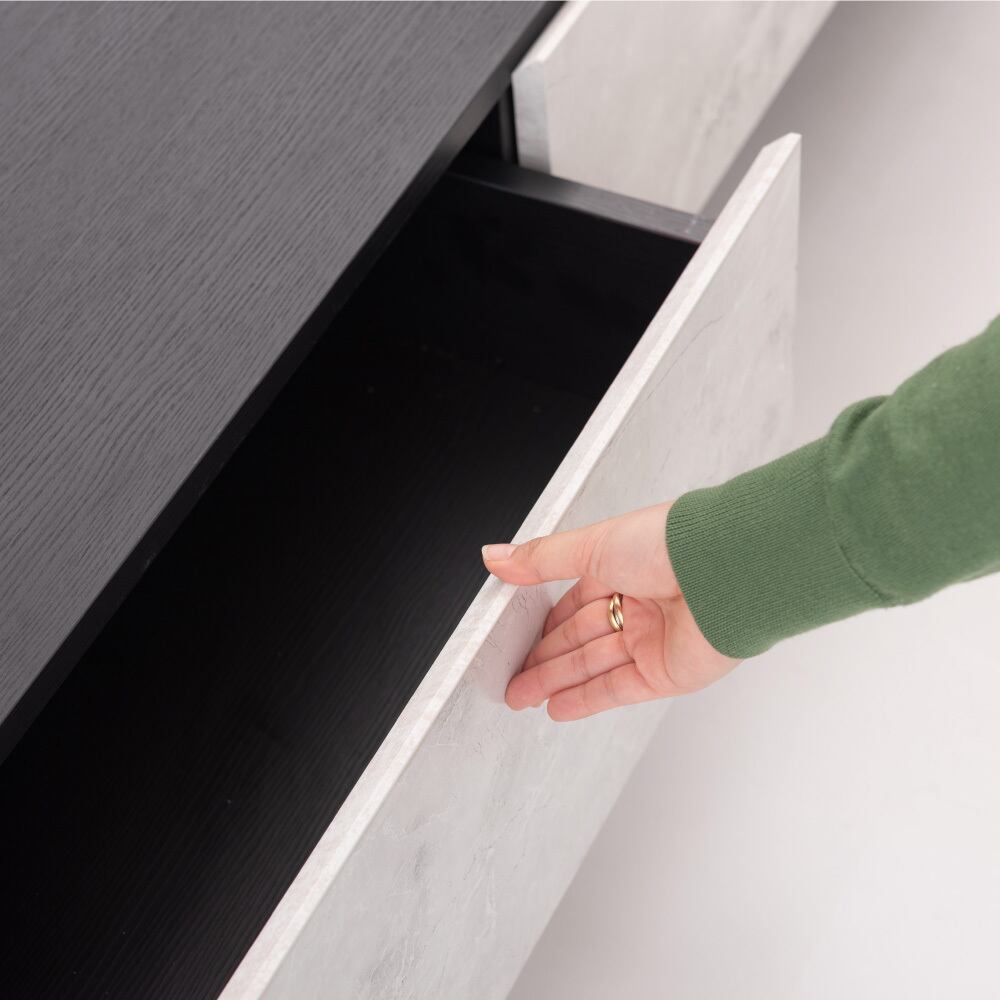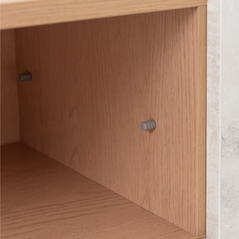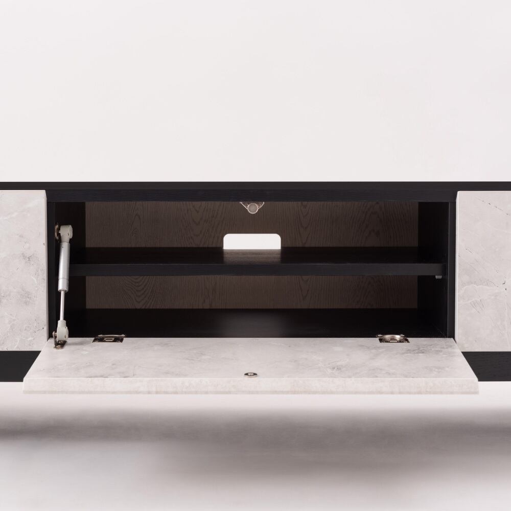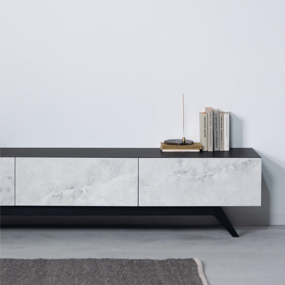洗練されたイメージで盛り上がりを見せている、モルタル調の石目柄を施した高級感溢れるTVボード。