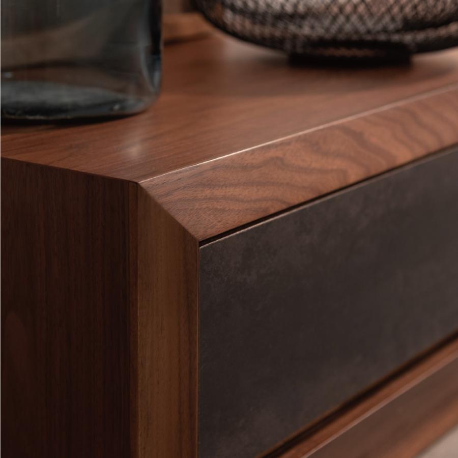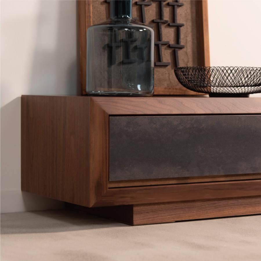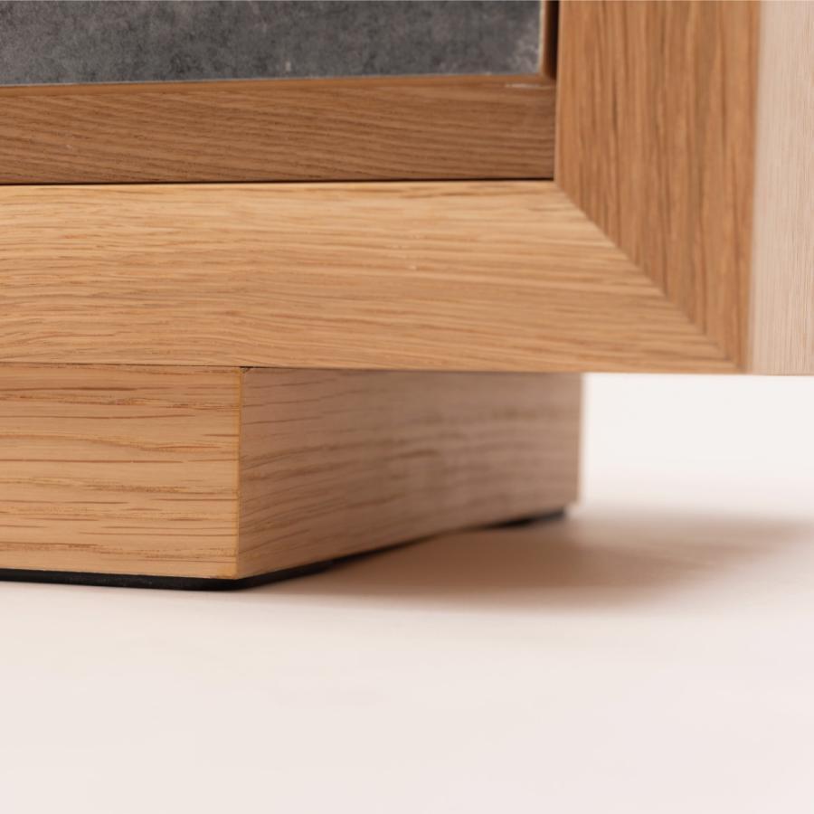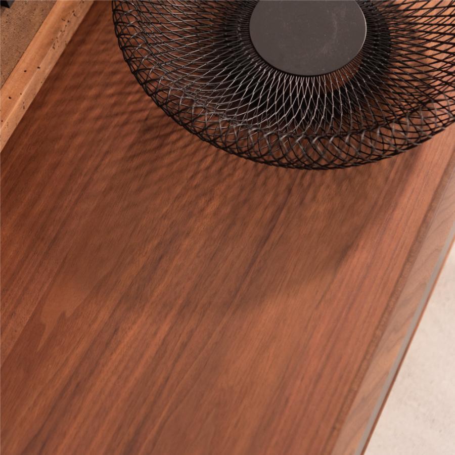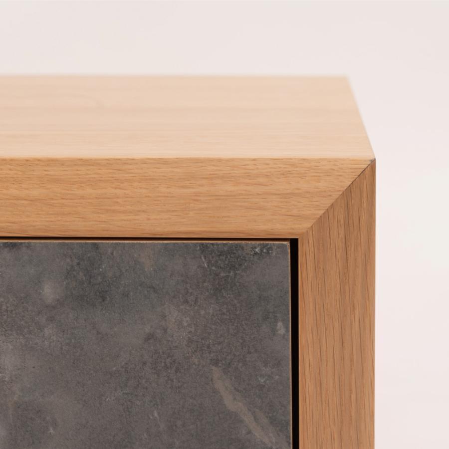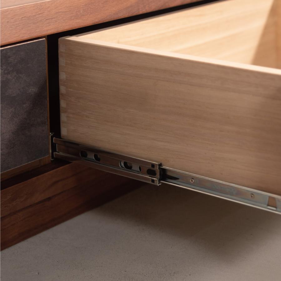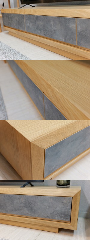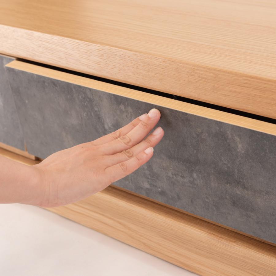 天然木の木目を生かしたデザインの本体に、石目調の引き出しと扉がアクセントになったローボード。
