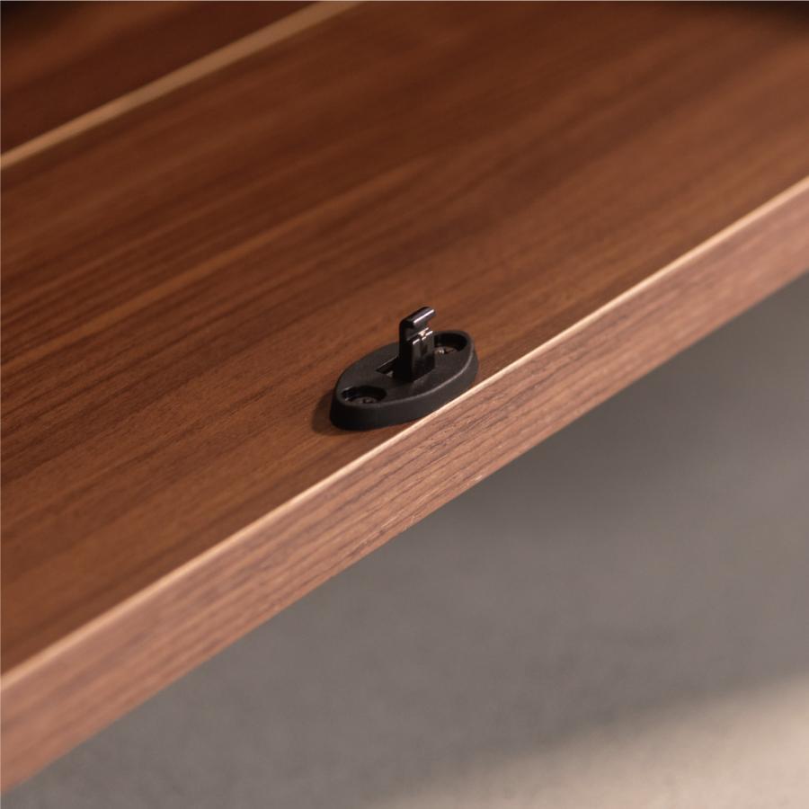 中央はプッシュ式のフラップ扉仕様、両サイドは引き出し仕様で、取っ手のないフラットなデザインに仕上げています。