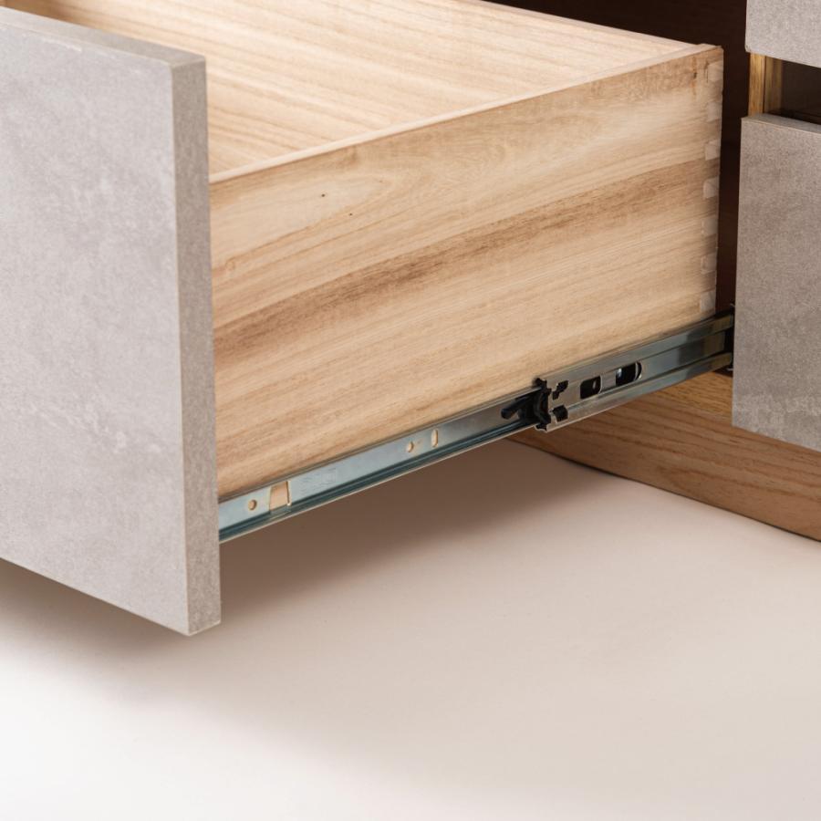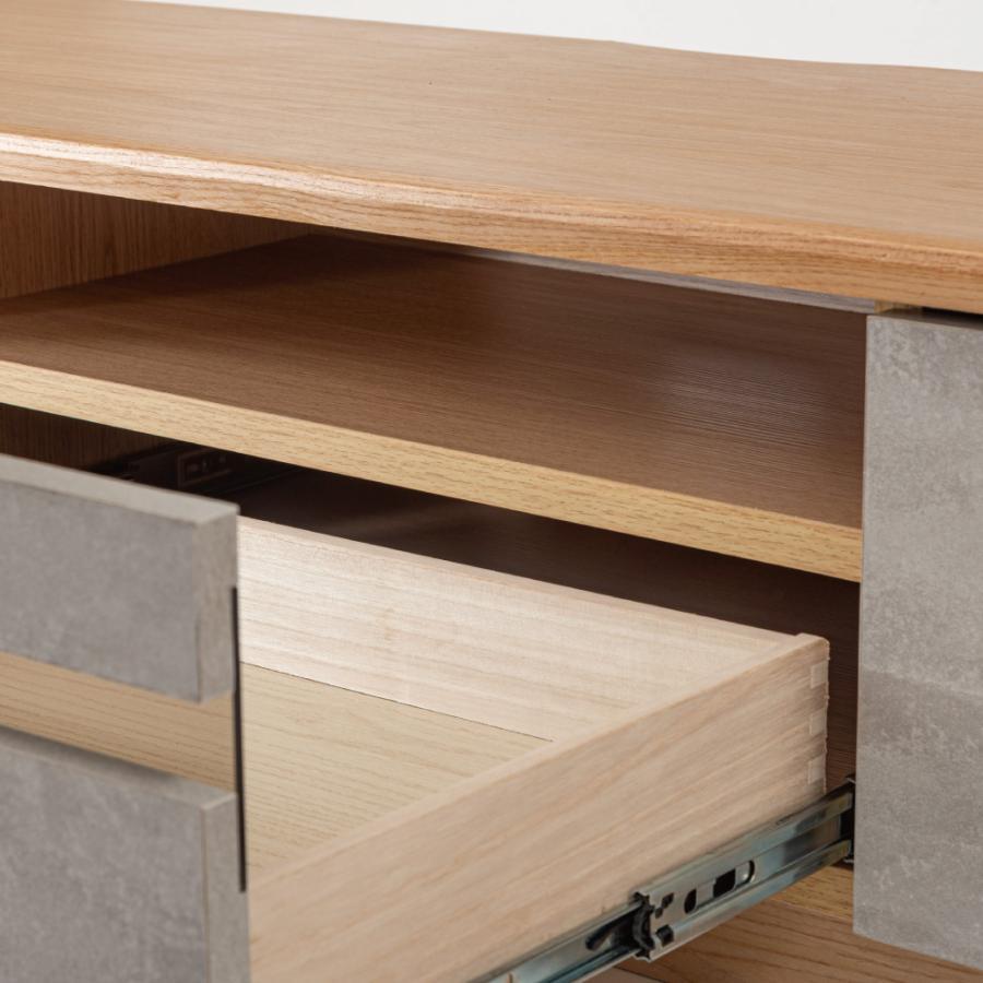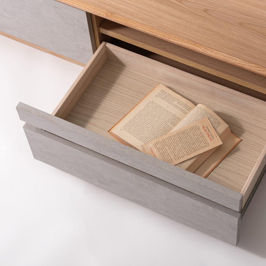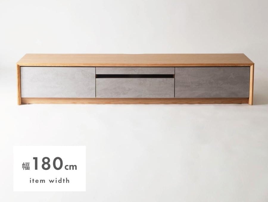 直線的なラインでシンプルなフォルムのローボード。木目を生かした本体に、石目調のデザインを施した前面がアクセントになっていて、スタイリッシュな風合いが空間を上品に仕上げます。