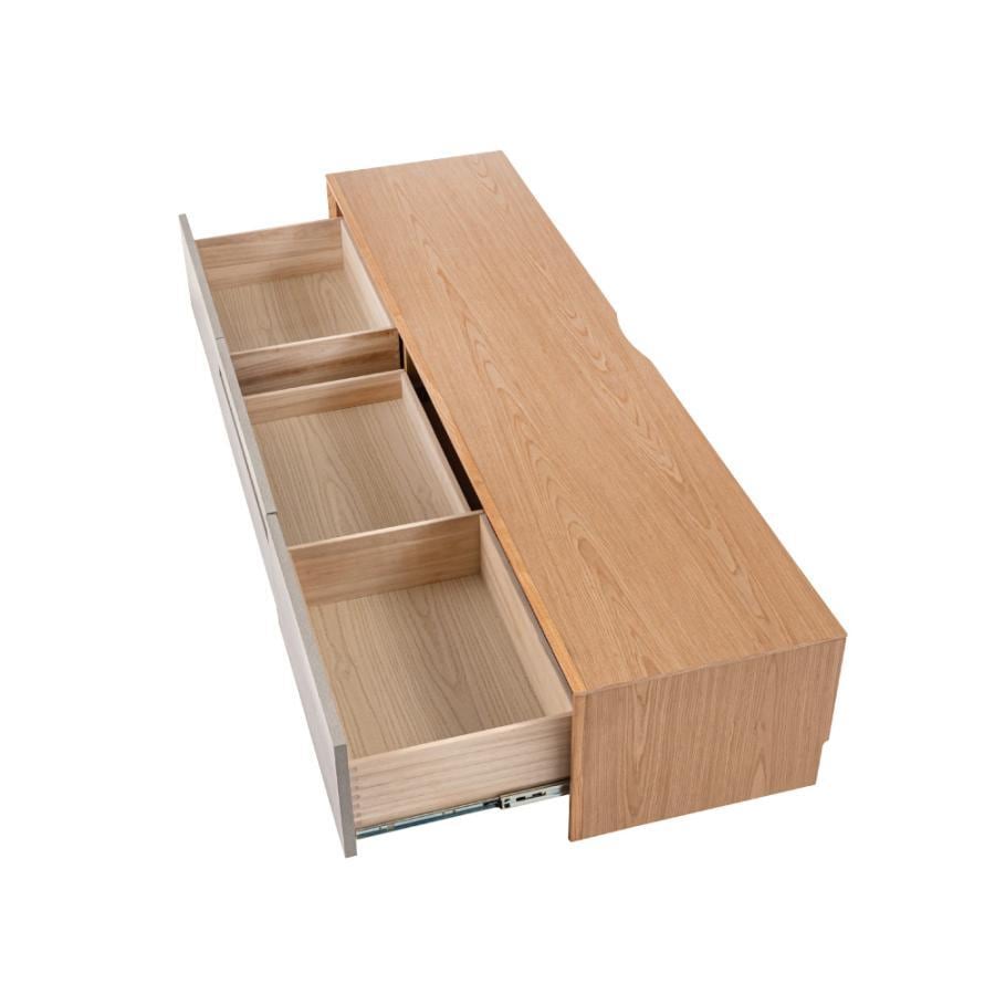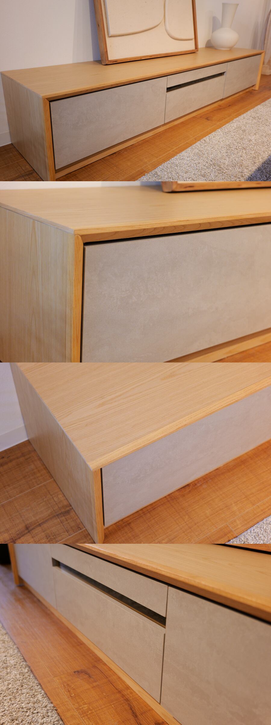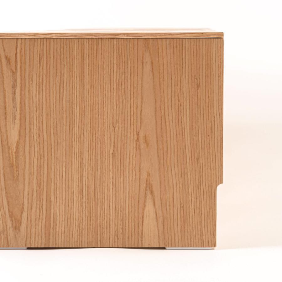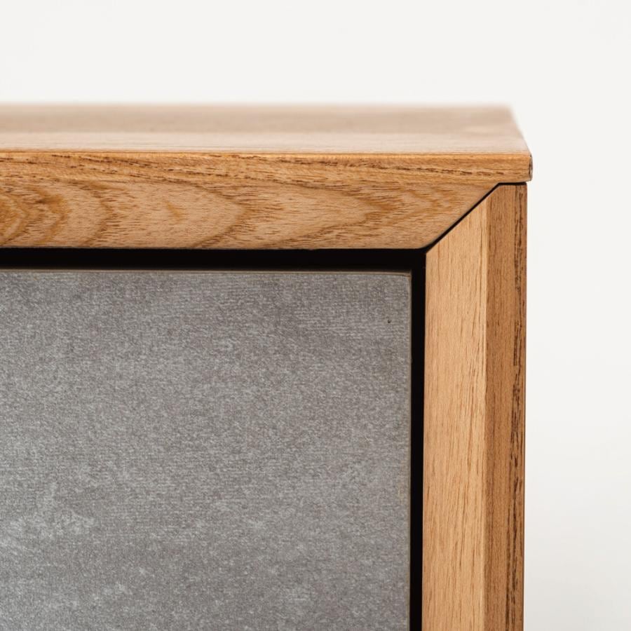 直線的なラインでシンプルなフォルムのローボード。木目を生かした本体に、石目調のデザインを施した前面がアクセントになっていて、スタイリッシュな風合いが空間を上品に仕上げます。